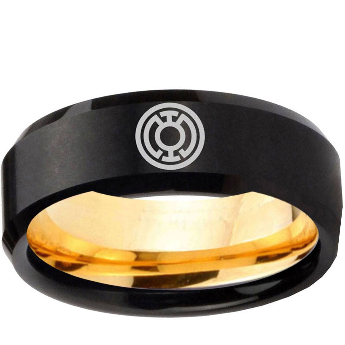 Intruding 8mm Blue Lantern Beveled Edge Gold Black Rings Engraved . Offer in 8mm band width black and gold plated finished from size 7 to 14