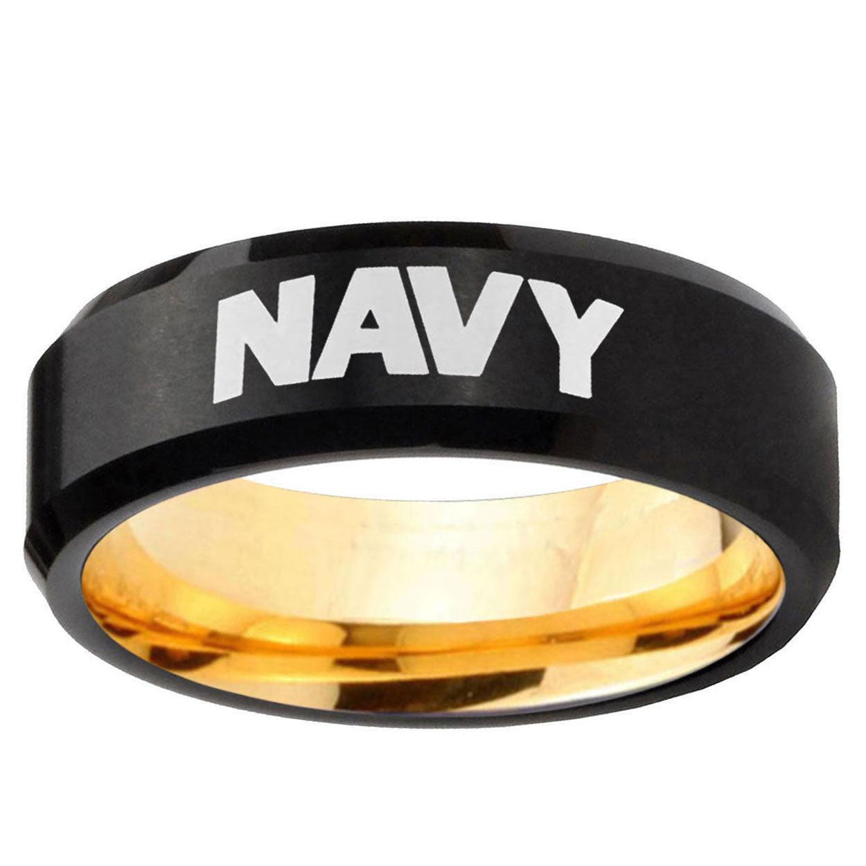 Intruding 8mm Navy Beveled Edge Black And Gold Tungsten Carbide Men's Wedding Band . Offer in men wedding band in 8mm band width black and gold plated finished from size 7 to 14