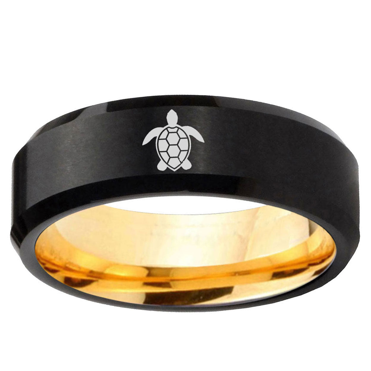 8mm Sea Turtle Design Beveled Edge Black And Gold Tungsten Engage Ring