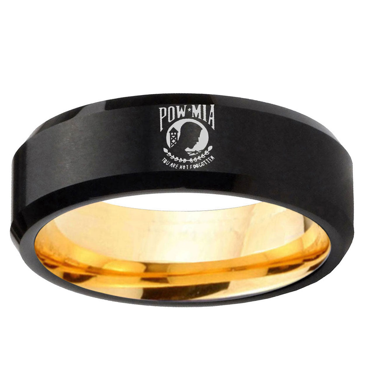 8mm Military Pow Beveled Edge Black And Gold Tungsten Carbide Men's Wedding Ring