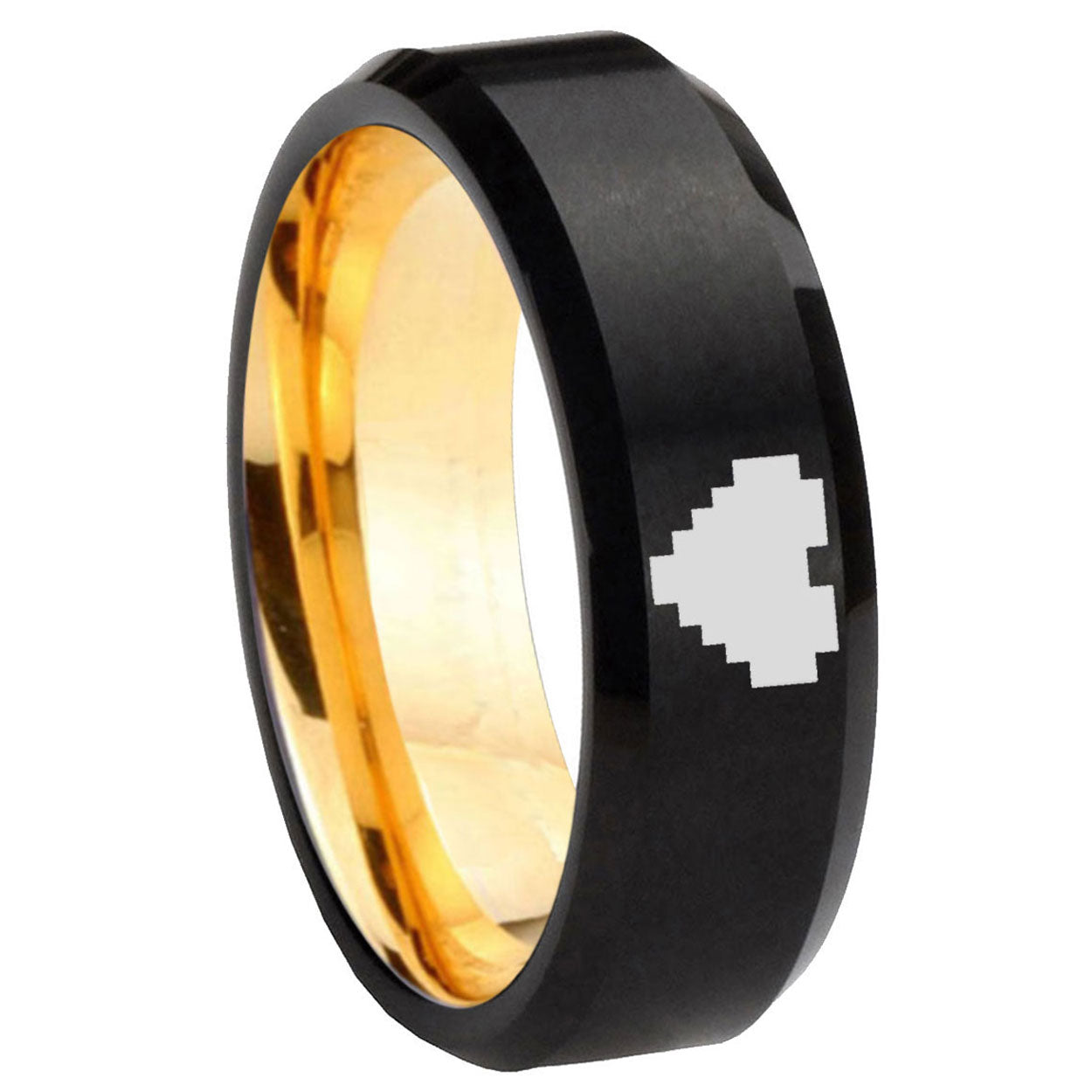 8mm Beveled Edge Black And Gold Zelda Heart Tungsten Carbide Laser Engraved Ring