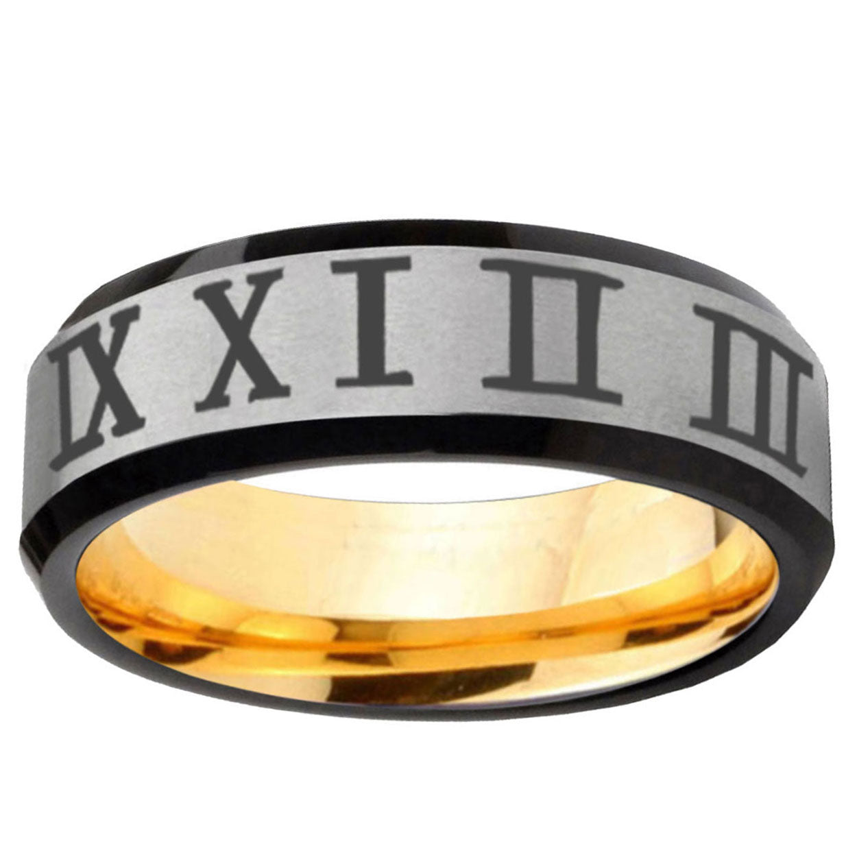 8mm Roman Numeral Beveled Edge Gray And Gold Tungsten Carbide Custom Ring for Men