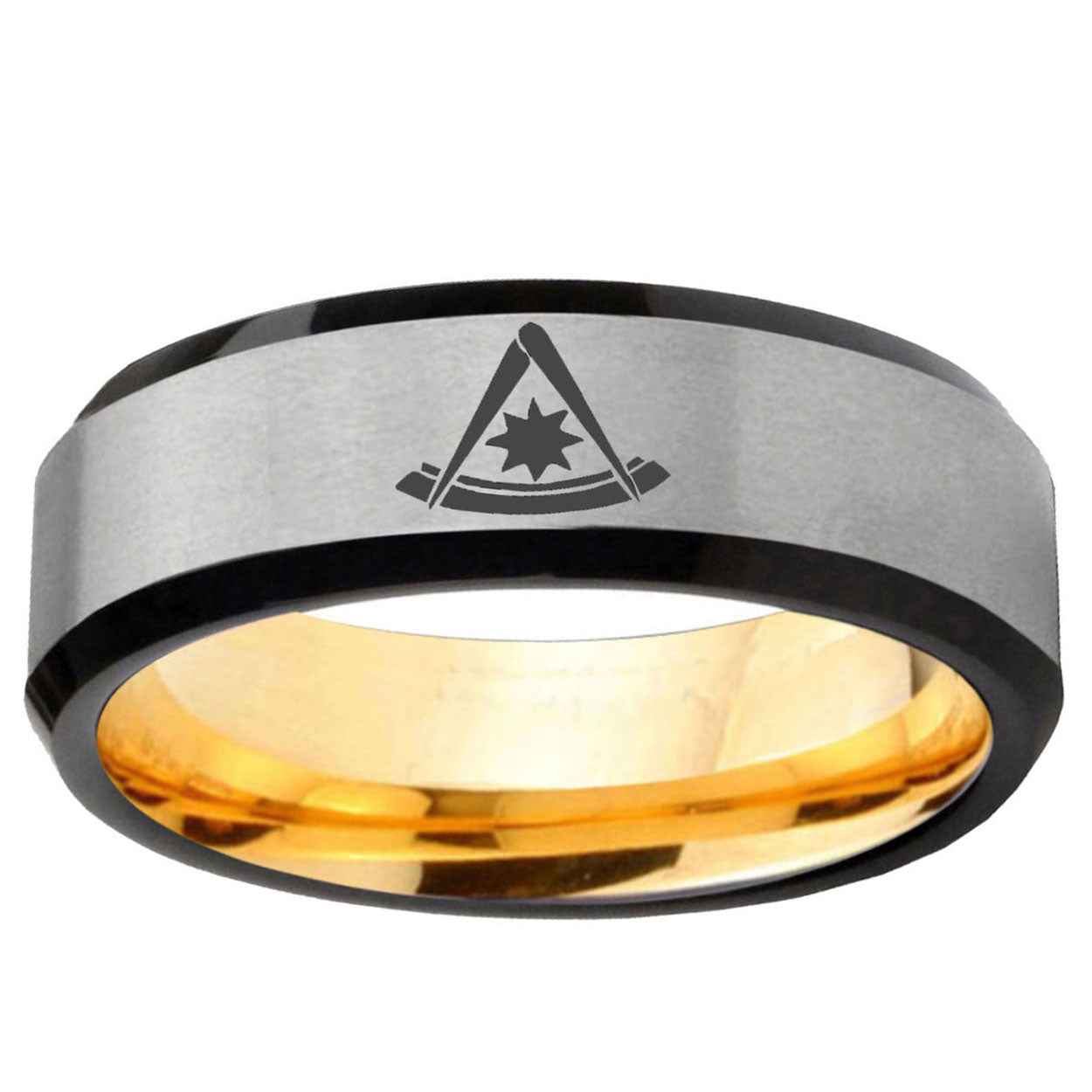 Intruding 8mm Pester Master Masonic Beveled Edge Gray And Gold Tungsten Mens Wedding Band . Offer in men wedding band in 8mm band width gray and gold plated finished from size 7 to 14