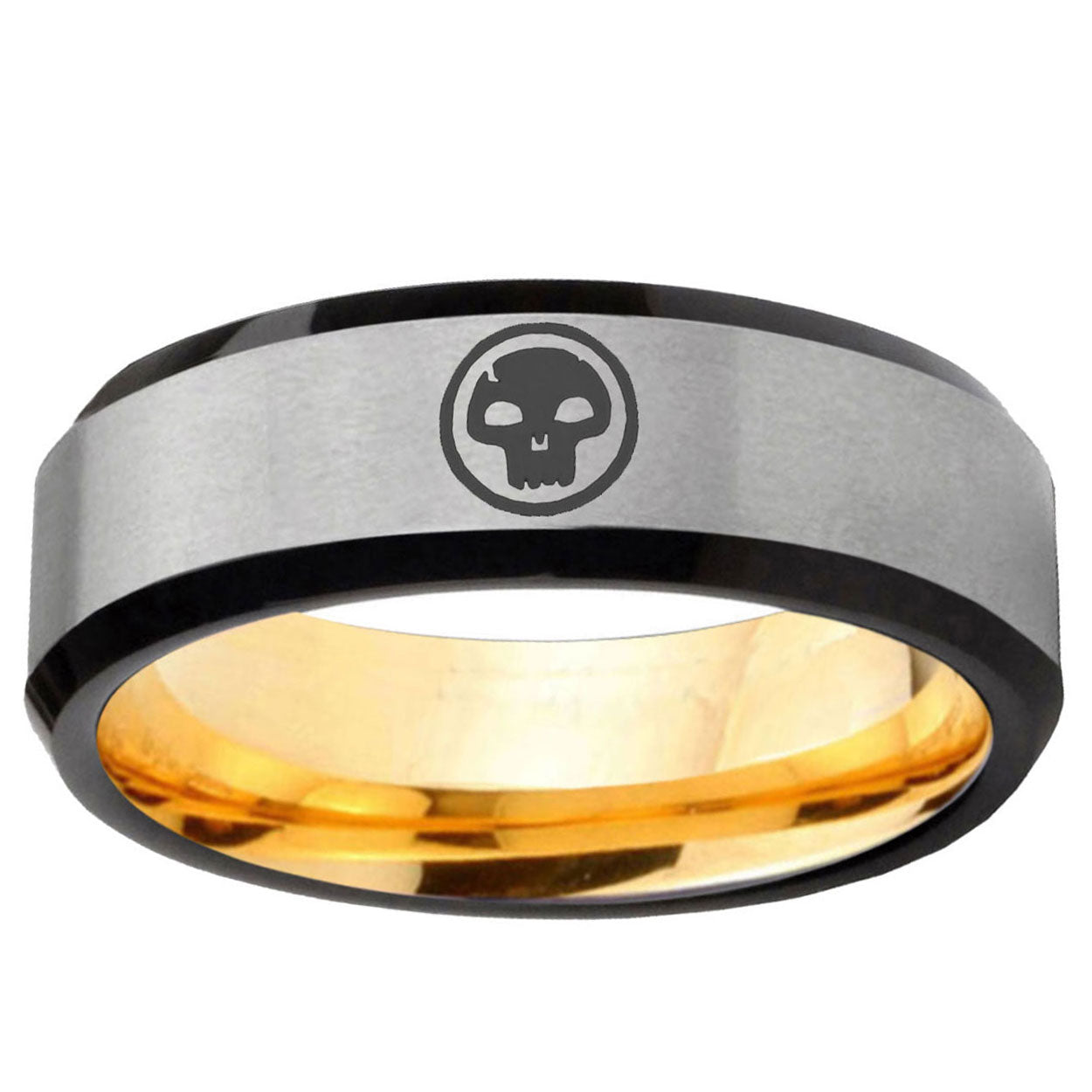 Intruding 8mm Skull Beveled Edge Gray And Gold Tungsten Carbide Wedding Engraving Ring . Offer in men wedding band in 8mm band width gray and gold plated finished from size 7 to 14