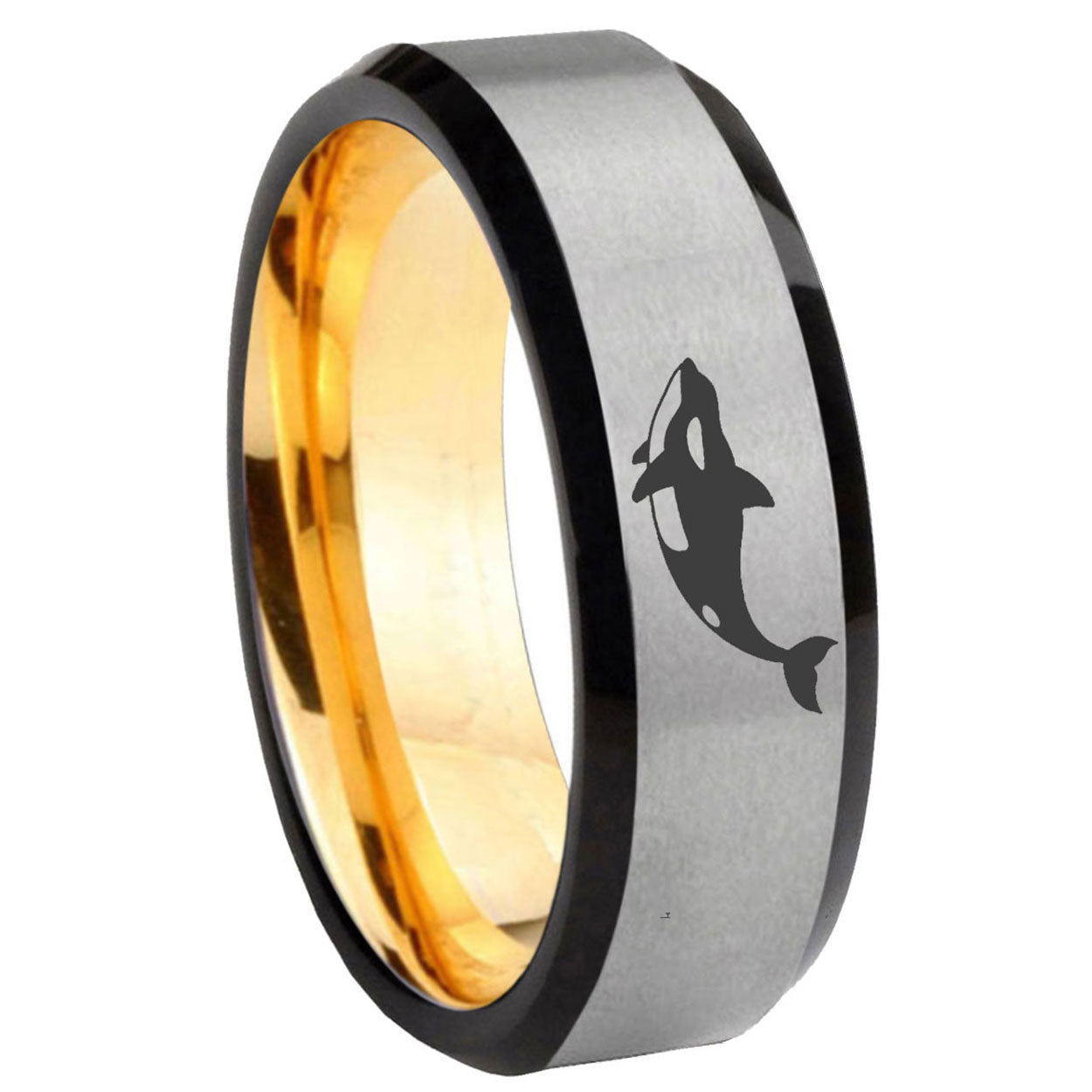Intruding 8mm Keller Whale Beveled Edge Gray And Gold Tungsten Carbide Men's Wedding Ring . Offer in men wedding band in 8mm band width gray and gold plated finished from size 7 to 14