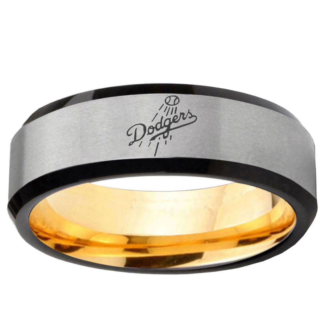 Intruding 8mm LA Dogers MLB Baseball Beveled Edge Gray And Gold Tungsten Mens Engagement Band . Offer in men wedding band in 8mm band width gray and gold plated finished from size 7 to 14