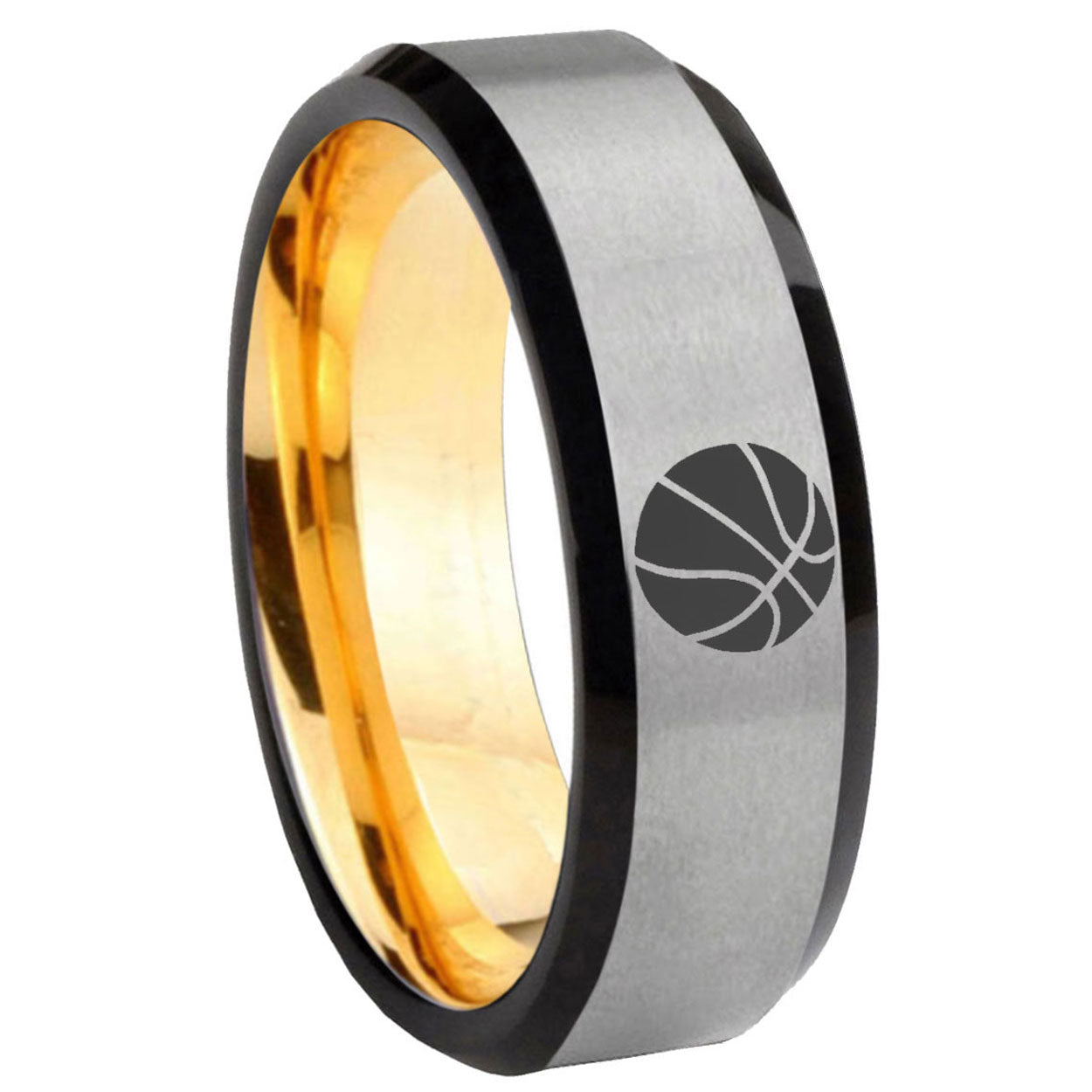 Intruding 8mm Basketball Beveled Edge Gray And Gold Tungsten Carbide Mens Promise Ring . Offer in men wedding band in 8mm band width gray and gold plated finished from size 7 to 14