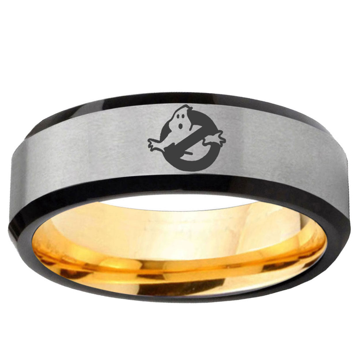 Intruding 8mm Ghostbusters Beveled Edge Gray And Gold Tungsten Carbide Wedding Band Mens . Offer in men wedding band in 8mm band width gray and gold plated finished from size 7 to 14