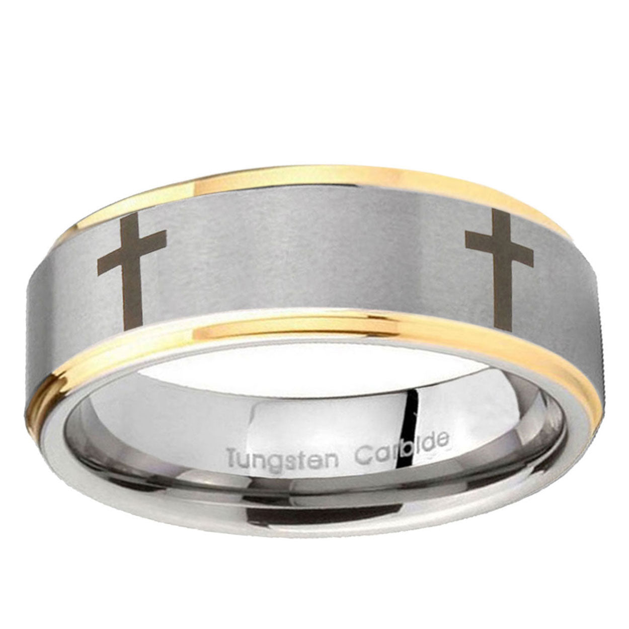 5, 8mm Crosses Step Edges Gold 2 Tone Tungsten Carbide Men's Ring