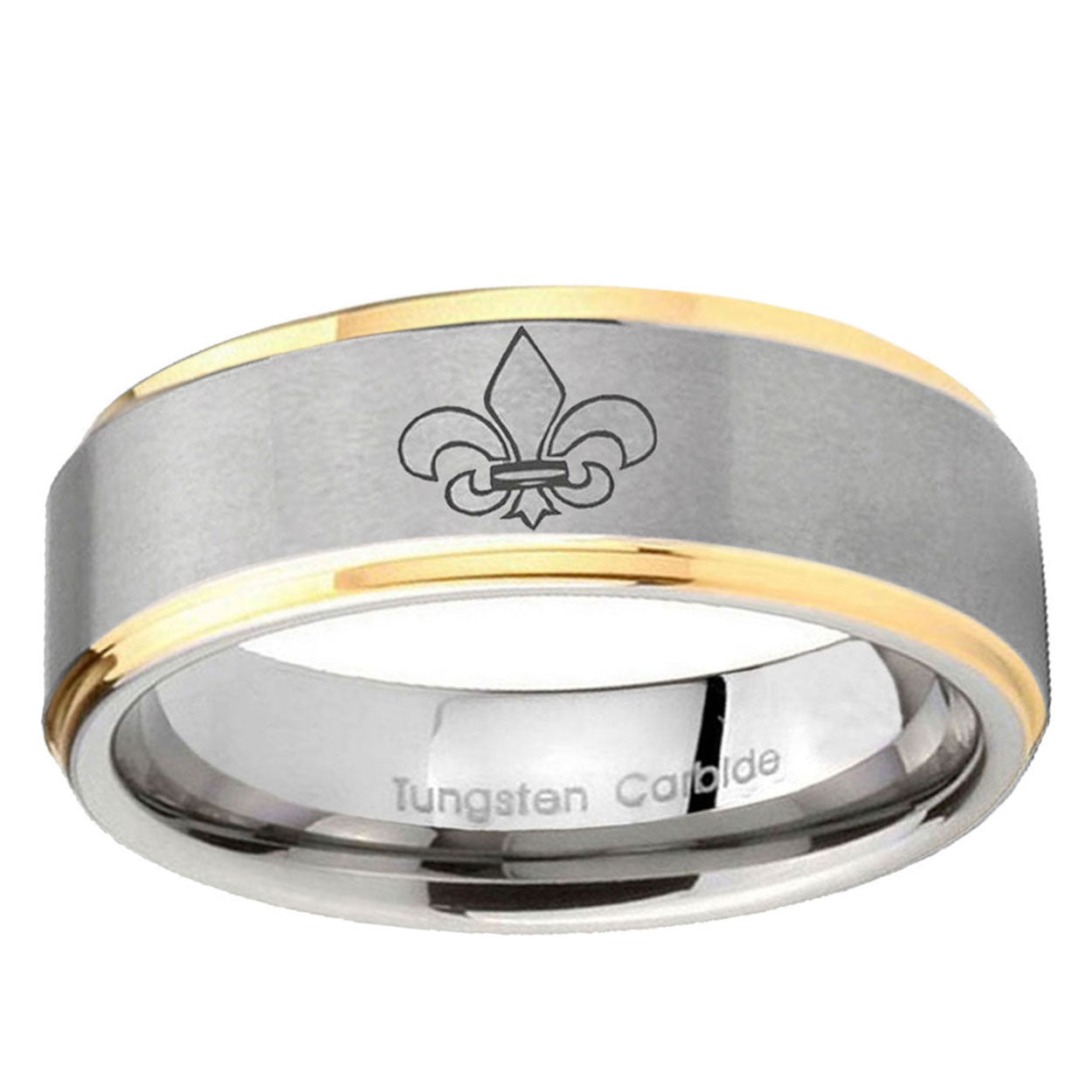 5, 8mm Fleur-De-Lis Step Edges Gold 2 Tone Tungsten Carbide Custom Mens Ring
