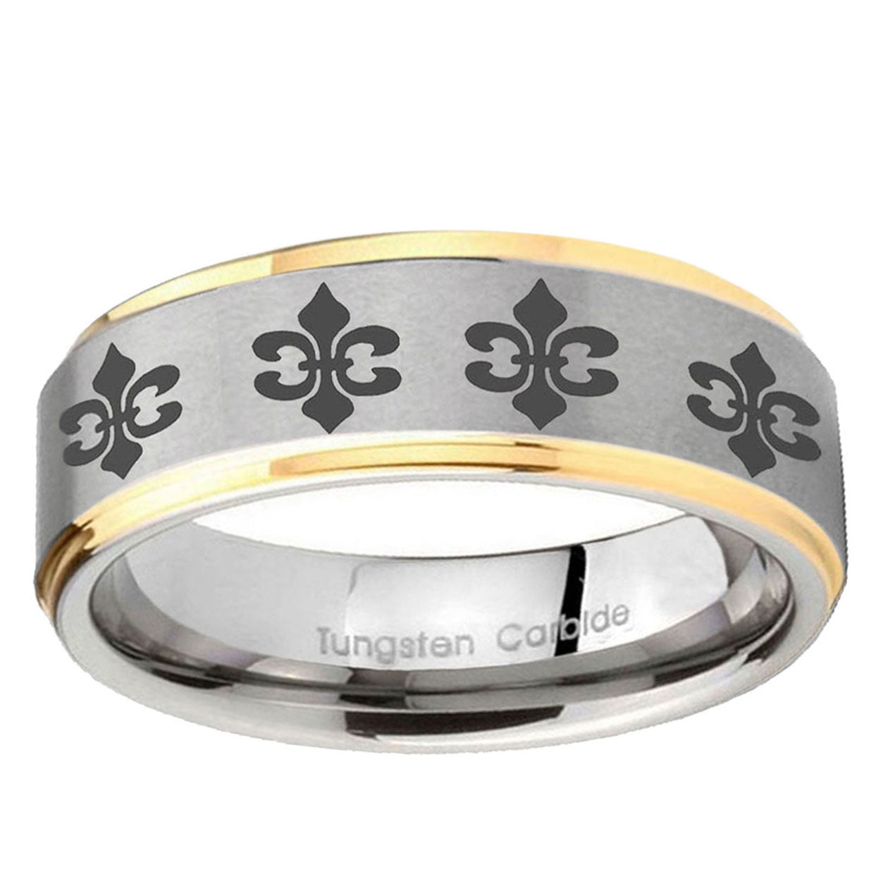Intruding 5, 8mm Multiple Fleur-De-Lis Step Edges Gold 2 Tone Tungsten Men's Bands Ring . Offer in both 5mm and 8mm band width grey and gold 2 tone finished from size 4 to 14