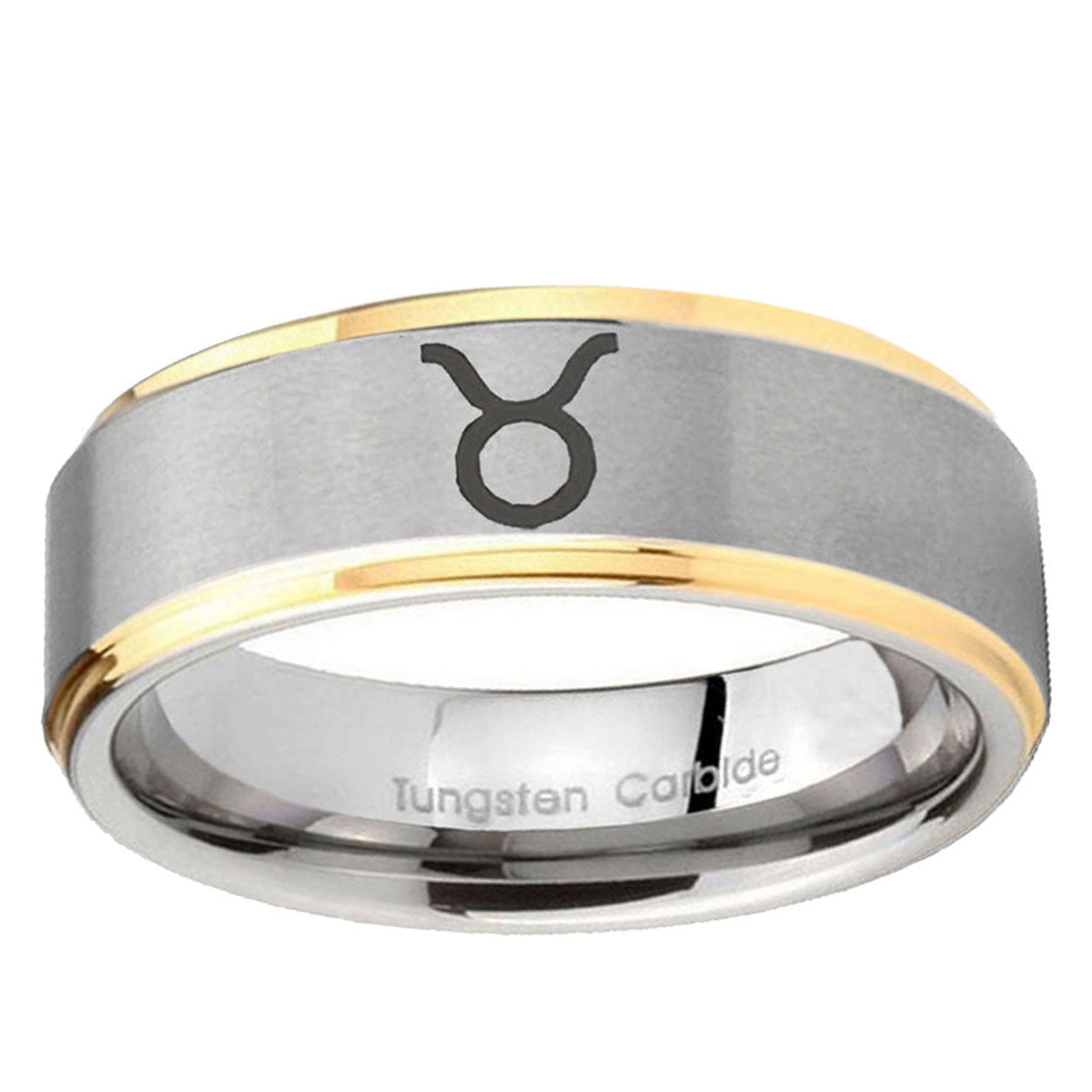 Intruding 5, 8mm Taurus Horoscope Step Edges Gold 2 Tone Tungsten Mens Ring Personalized . Offer in both 5mm and 8mm band width grey and gold 2 tone finished from size 4 to 14