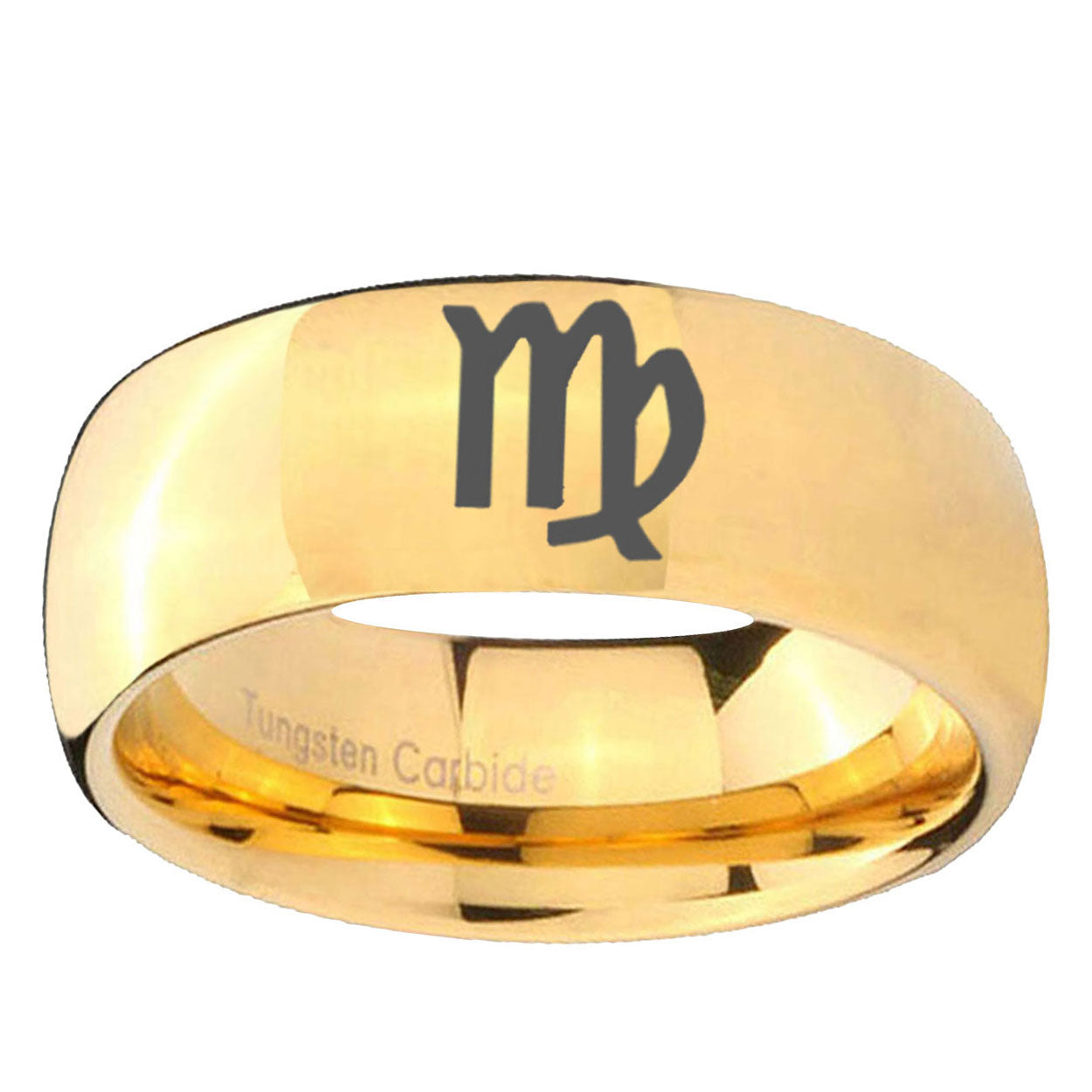 Celebrate with the 10mm Virgo Zodiac Dome Gold Tungsten Carbide Mens Wedding Band. This gold-finished tungsten ring with Virgo Zodiac design is perfect for weddings.