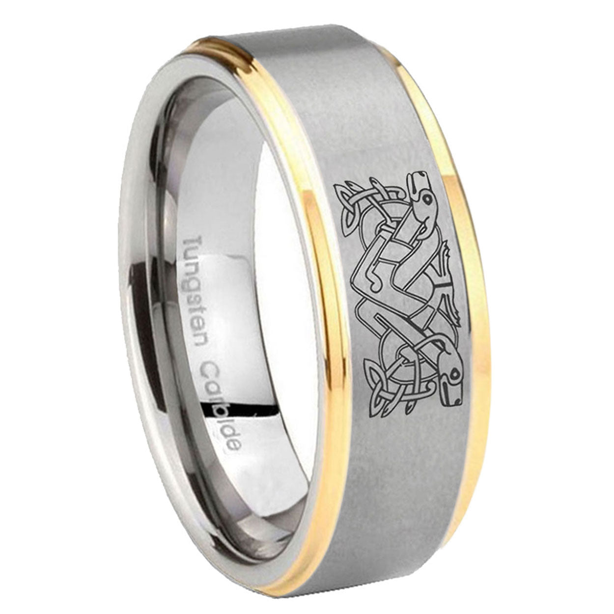 Celebrate with the 10mm Celtic Dog Step Edges Gold 2 Tone Tungsten Carbide Bands Ring. This gold and 2-tone tungsten ring with Celtic dog design is ideal for weddings.