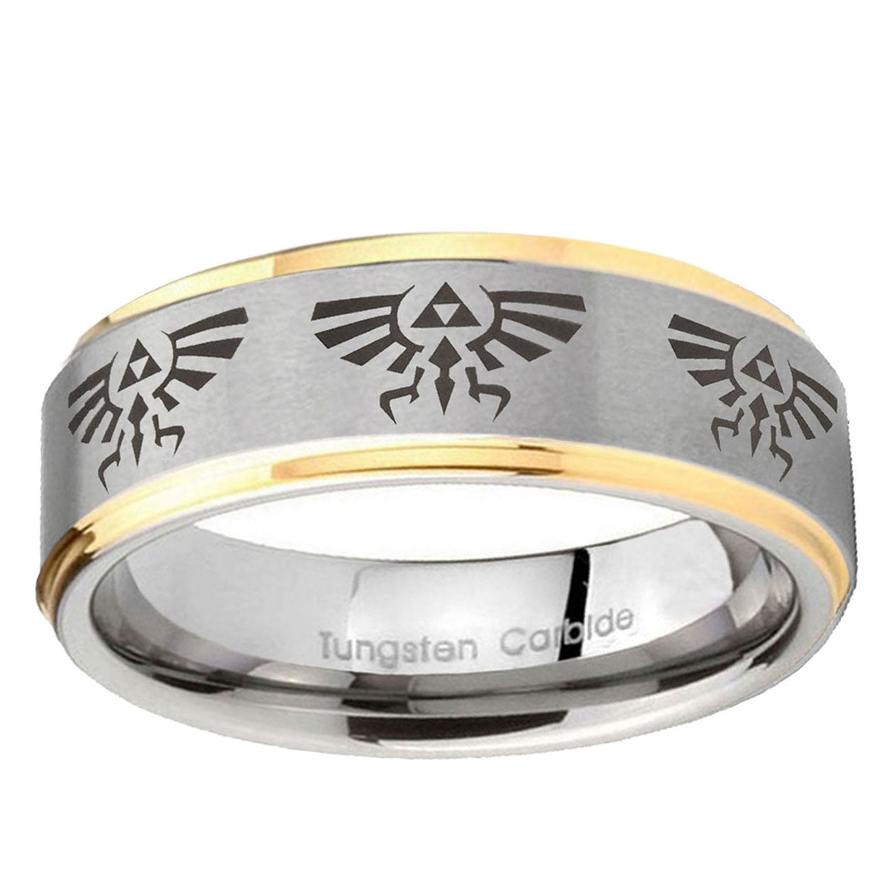 Intruding 5, 8mm Multiple Zelda Skyward Sword Step Edges Gold 2 Tone Tungsten Men's Band Ring . Offer in both 5mm and 8mm band width grey and gold 2 tone finished from size 4 to 14