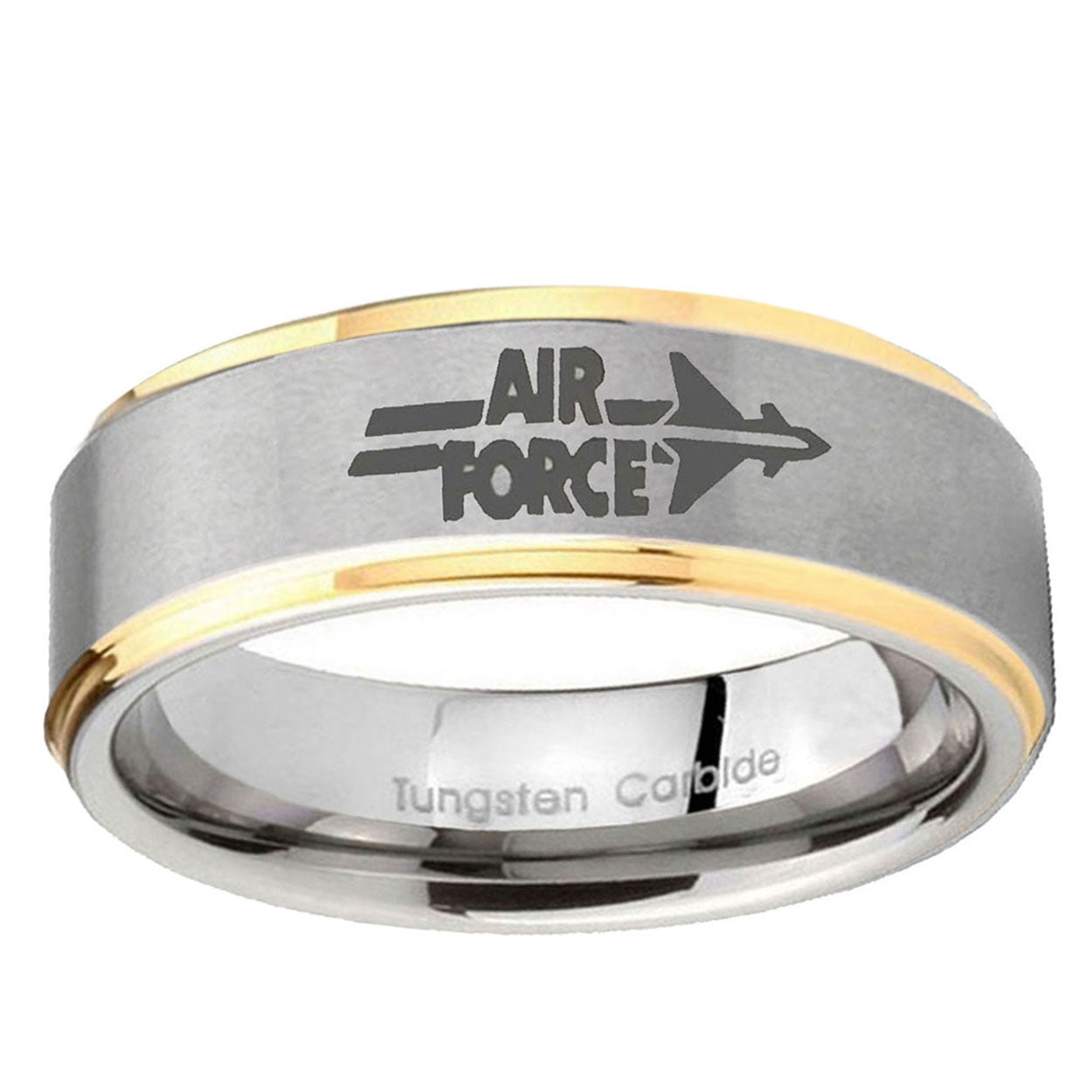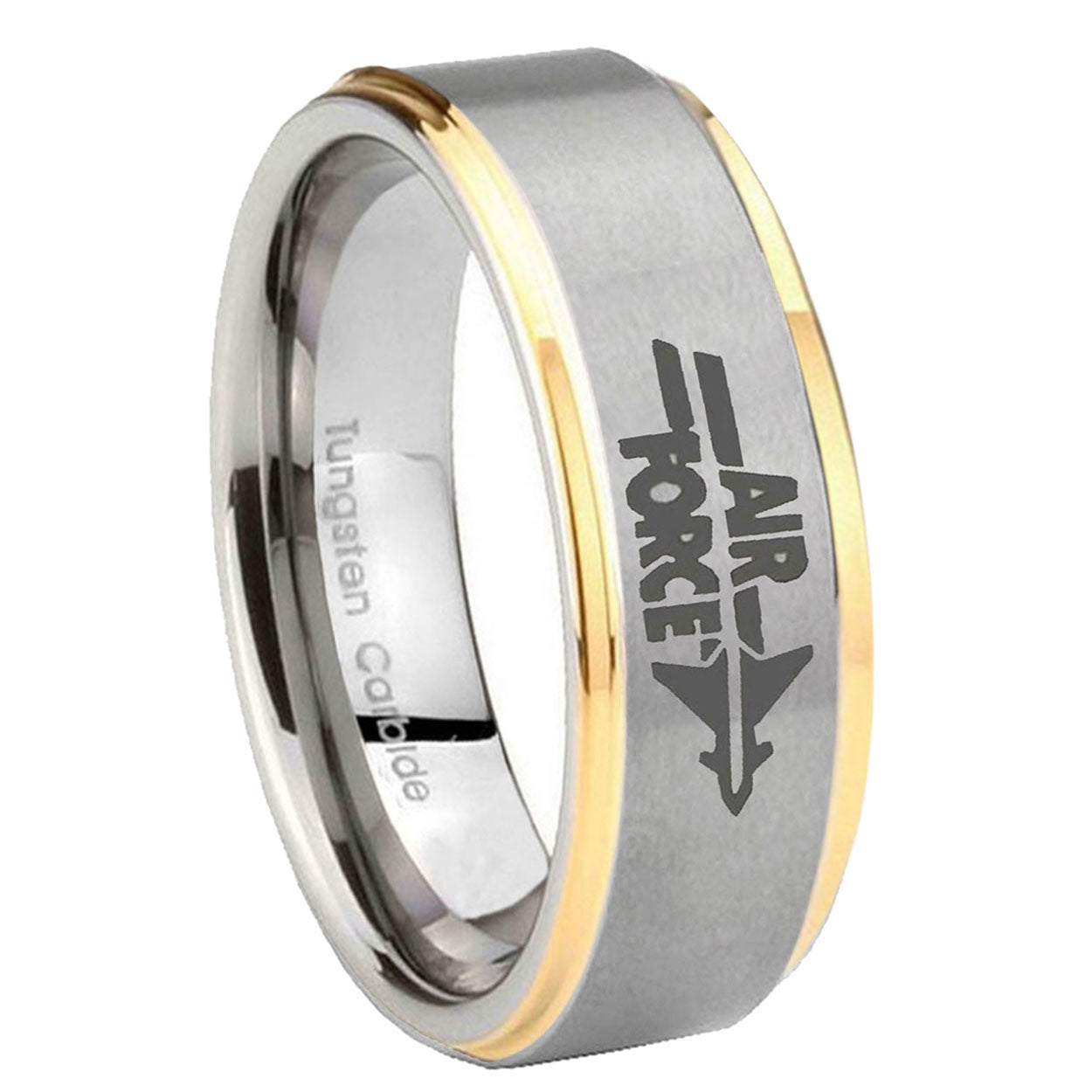 Style the 10mm Step Edges Air Force 14K Gold IP Tungsten Two Tone Men's Ring. This gold and two-tone tungsten ring with Air Force design is perfect for men.