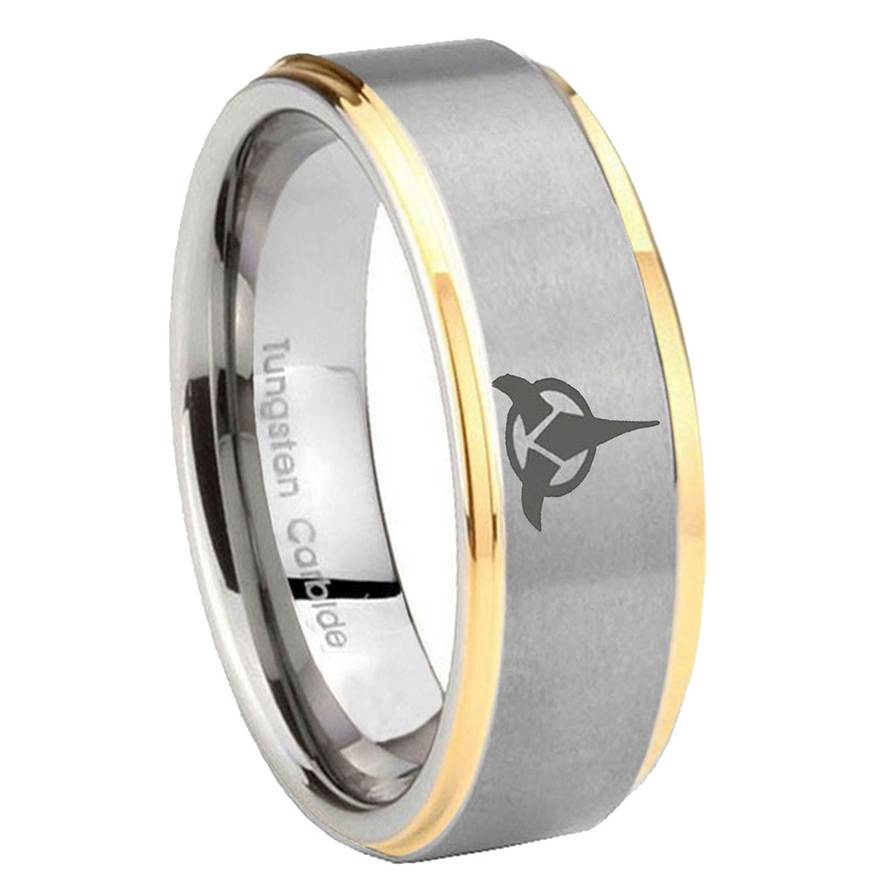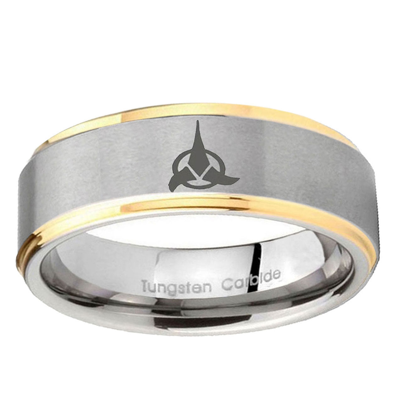 Intruding 5, 8mm Klingon Step Edges Gold 2 Tone Tungsten Carbide Mens Ring Personalized . Offer in both 5mm and 8mm band width grey and gold 2 tone finished from size 4 to 14