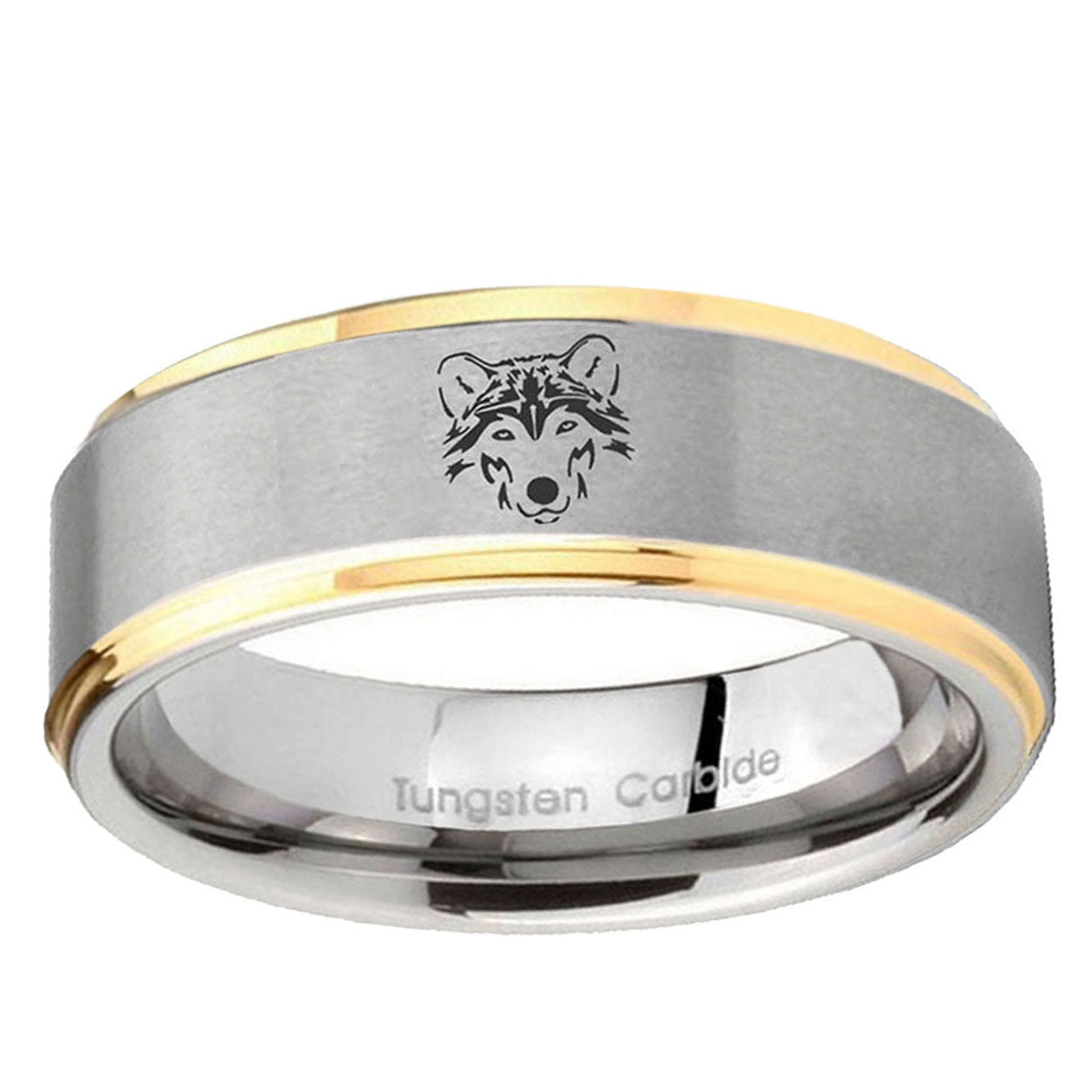 Style the 10mm Wolf Step Edges Gold 2 Tone Tungsten Carbide Bands Ring. This gold and 2-tone tungsten ring with Wolf design is perfect for men.