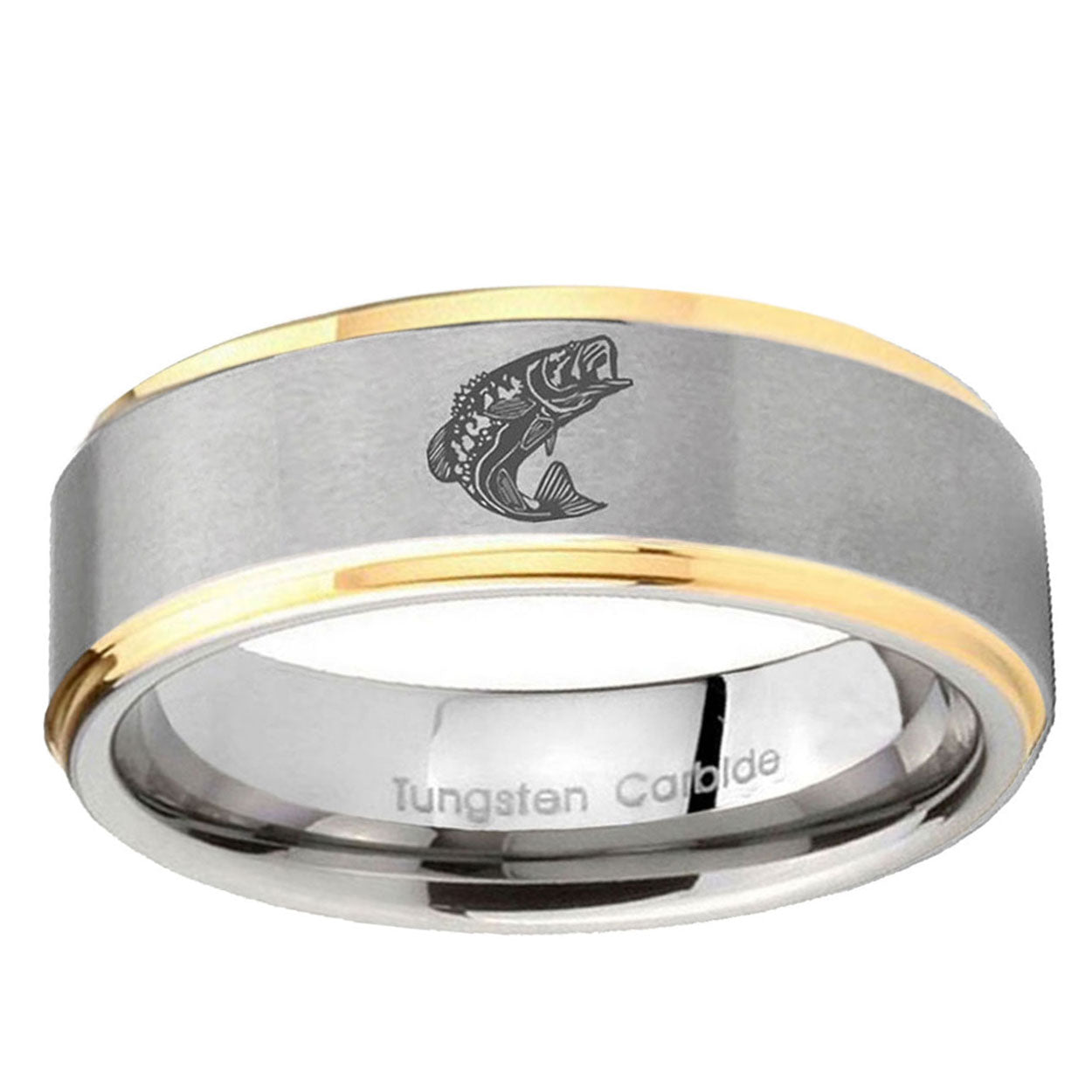 Celebrate with the 10mm Fishing Step Edges Gold 2 Tone Tungsten Carbide Bands Ring. This gold and 2-tone tungsten ring with Fishing design is ideal for weddings.
