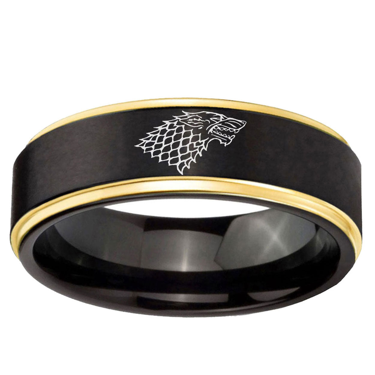 10mm Game Of Thrones House Stark Direwolf Gold Step Edges Brushed Tungsten Carbide Mens Promise Ring