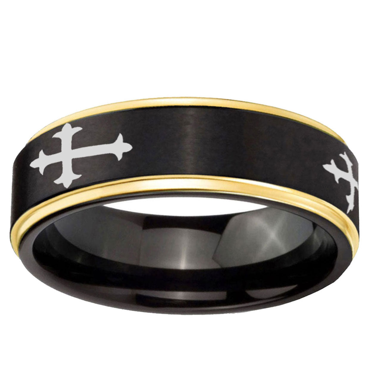 Celebrate with the 10mm Christian Cross Religious Gold Step Edges Black Tungsten Carbide Wedding Ring. This gold and black tungsten ring with Christian cross religious design is ideal for weddings.