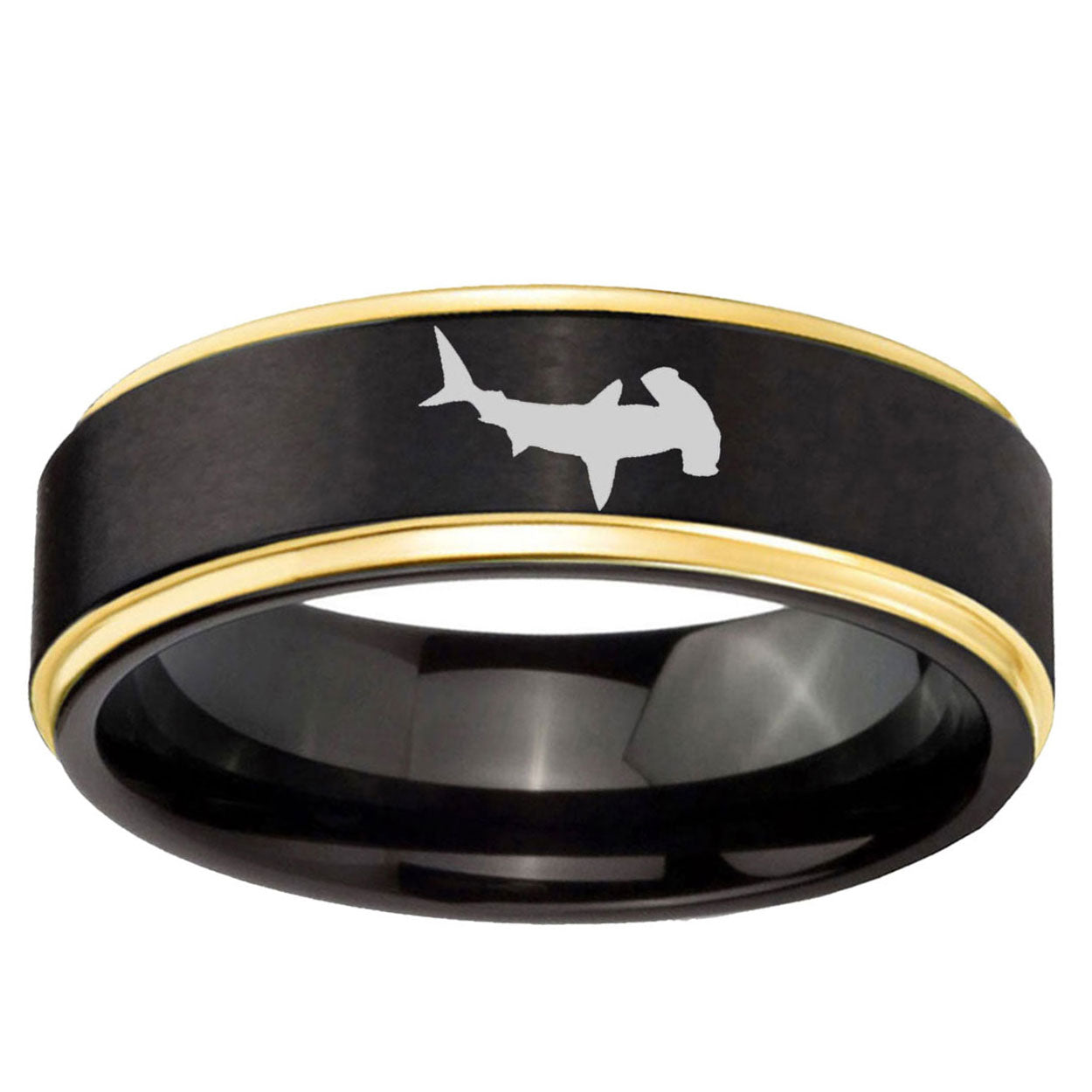 Make a promise with the 10mm Hammerhead Shark Gold Step Edges Brushed Tungsten Carbide Mens Promise Ring. This gold and brushed tungsten ring with Hammerhead Shark design is ideal for commitments.
