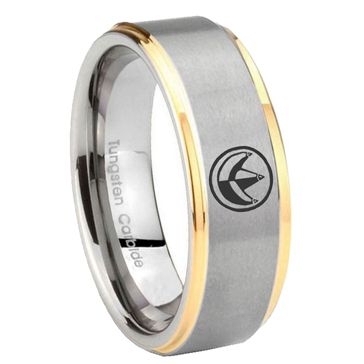 Intruding 5, 8mm Green Ranger Power Step Edges Gold 2 Tone Tungsten Carbide Mens Ring . Offer in both 5mm and 8mm band width grey and gold 2 tone finished from size 4 to 14