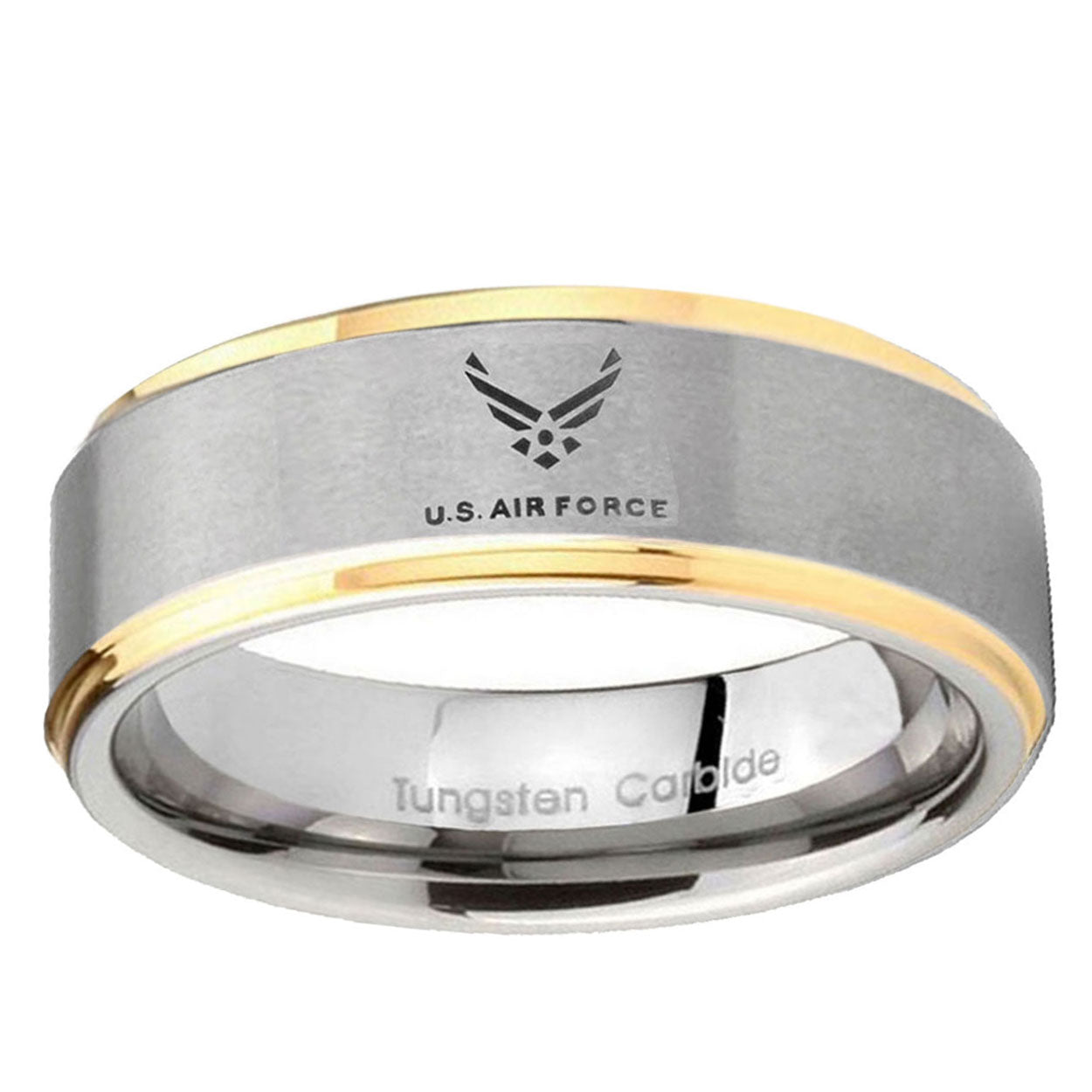 Style the 10mm Step Edges US Air Force 14K Gold IP Tungsten Two Tone Men's Ring. This gold and two-tone tungsten ring with US Air Force design is perfect for men.