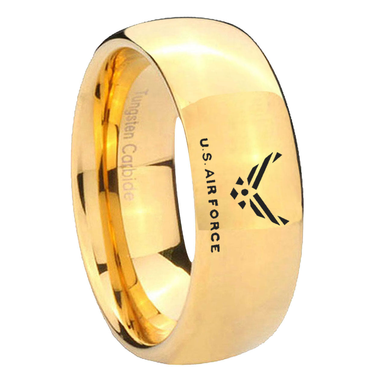 Intruding 5, 8mm Mirror Dome US Air Force 14K Gold IP Tungsten Carbide Laser Engraved Ring . Offer in both 5mm and 8mm band width polished 18k gold plated finished from size 4 to 14