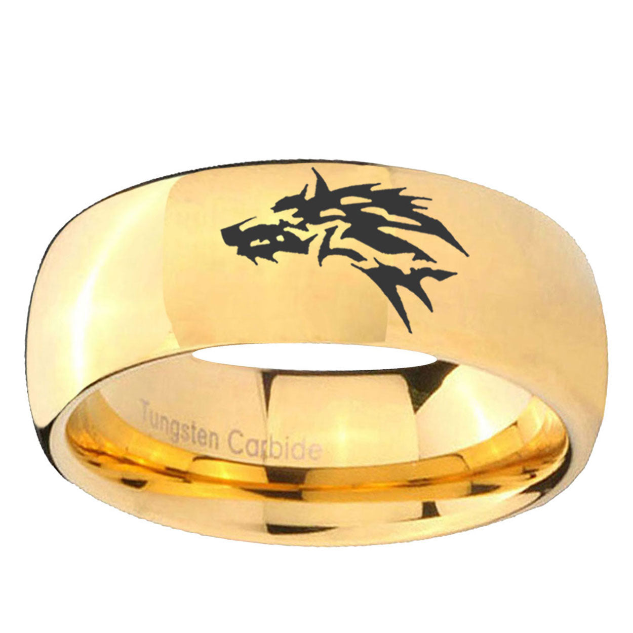 Intruding 5, 8mm Wolf Dome Gold Tungsten Carbide Mens Engagement Ring . Offer in both 5mm and 8mm band width polished 18k gold plated finished from size 4 to 14