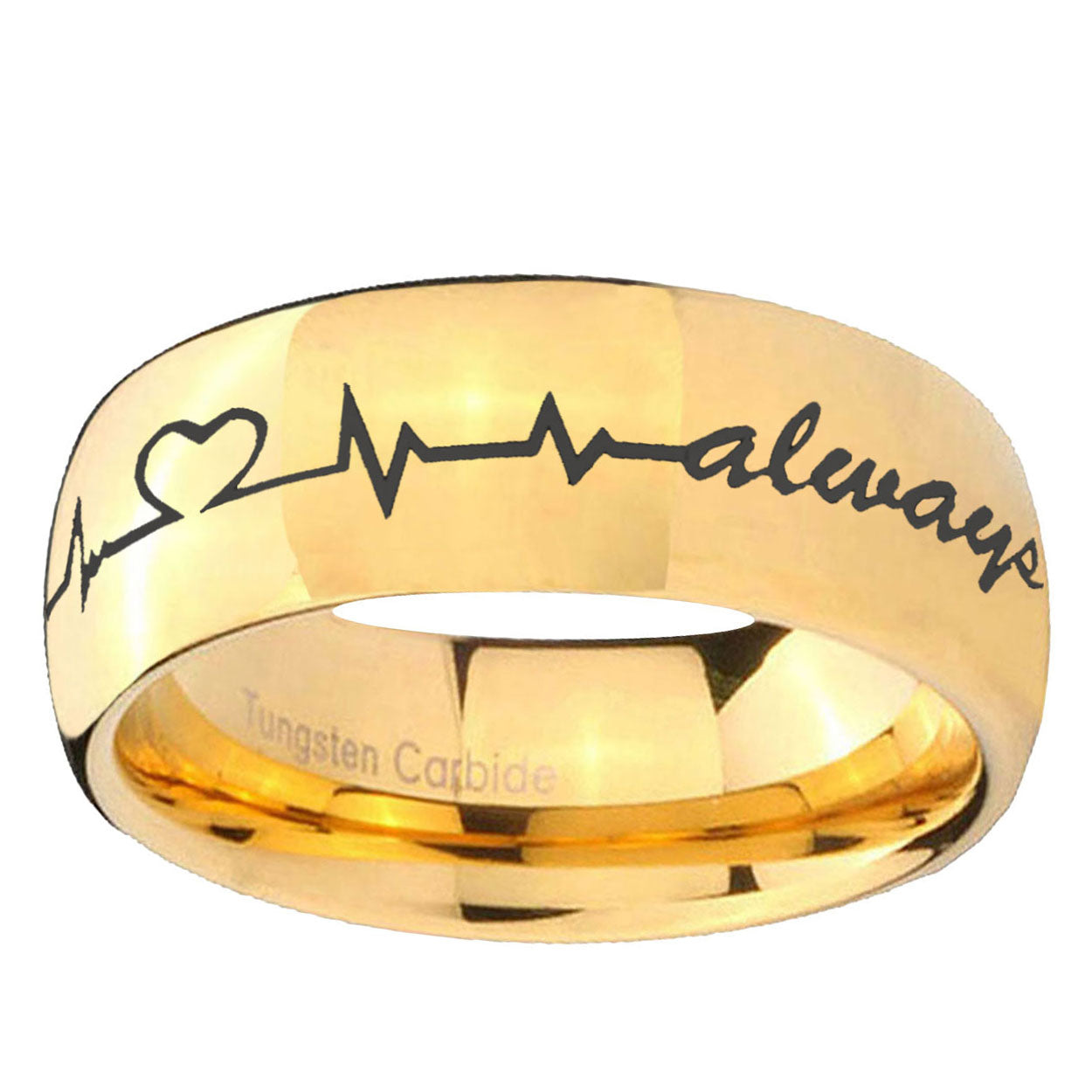 Propose with the 10mm Heart Beat forever Heart always Dome Gold Tungsten Men's Engagement Band. This gold-finished tungsten ring with Heart Beat design is ideal for engagements.