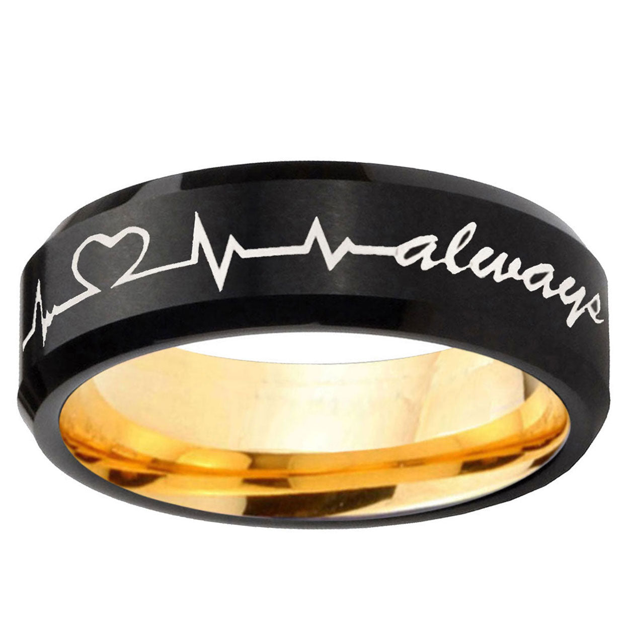 8mm Heart Beat forever Heart always Beveled Tungsten Carbide Black Gold Mens Promise Ring