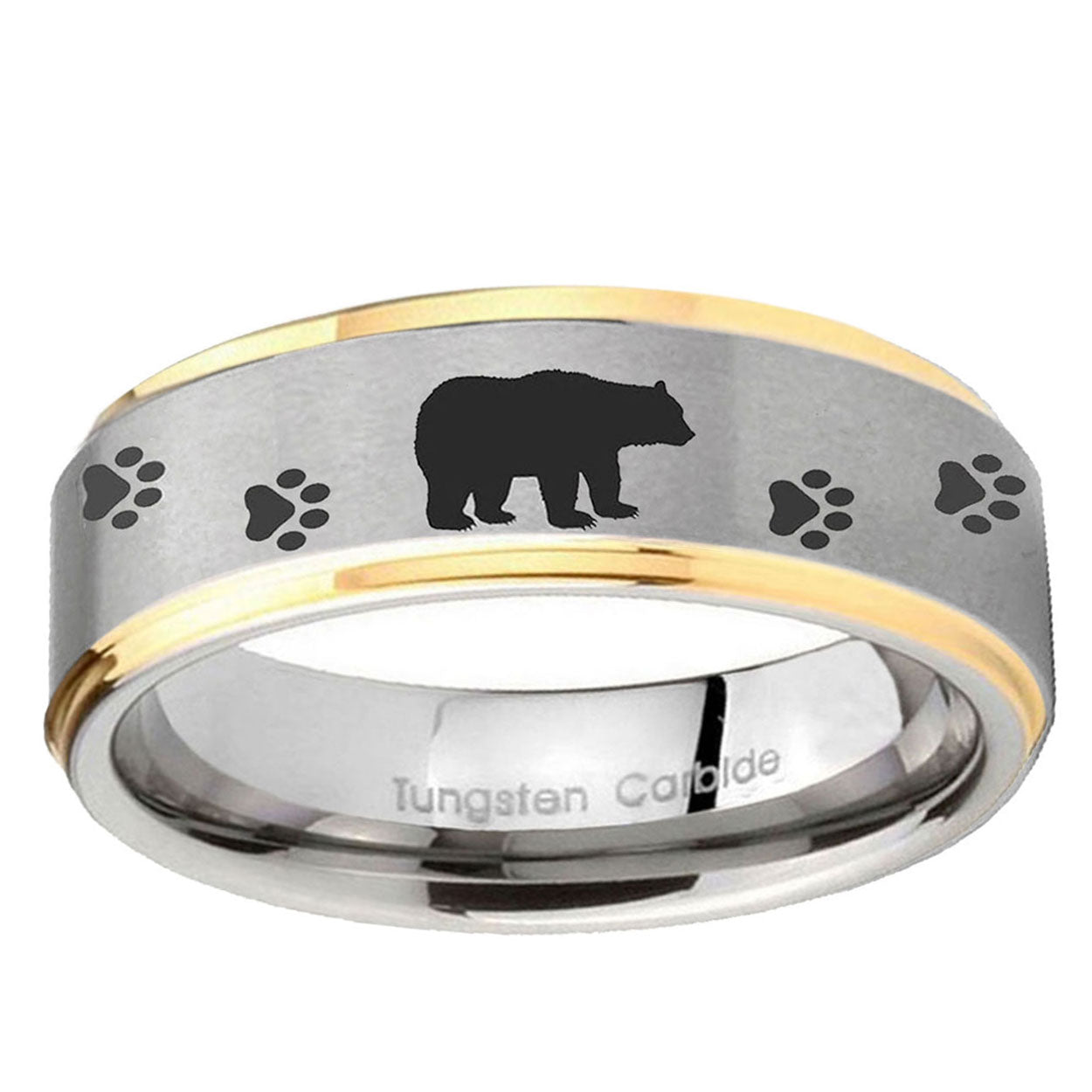 5, 8mm Bear and Paw Step Edges Gold 2 Tone Tungsten Carbide Engraved Ring