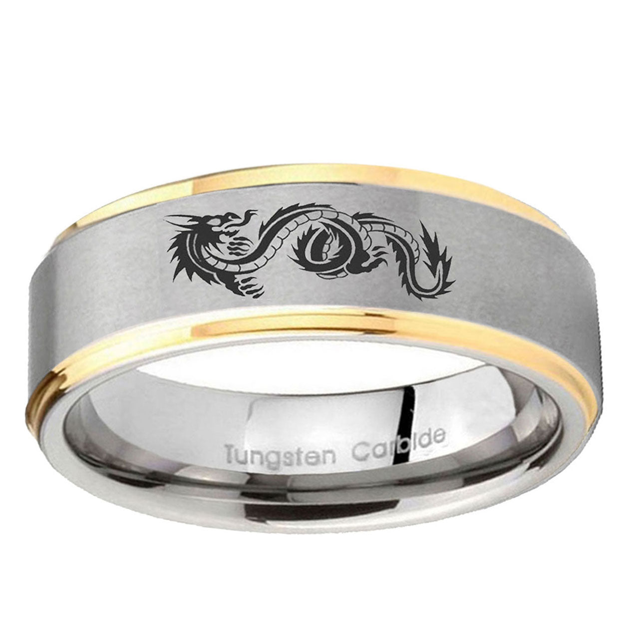 Celebrate with the 10mm Dragon Step Edges Gold 2 Tone Tungsten Carbide Men's Bands Ring. This gold and 2-tone tungsten ring with Dragon design is perfect for weddings.