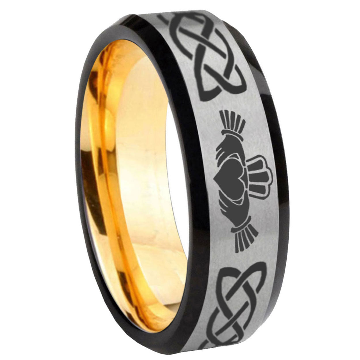 8mm Irish Claddagh Beveled Tungsten Carbide Silver Gold Mens Engagement Ring