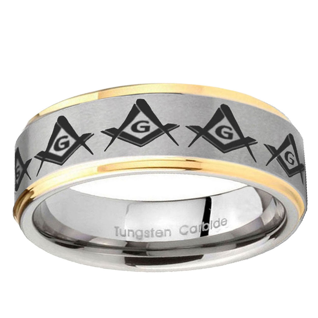 5, 8mm Masonic Square and Compass Step Edges Gold 2 Tone Tungsten Carbide Custom Mens Ring