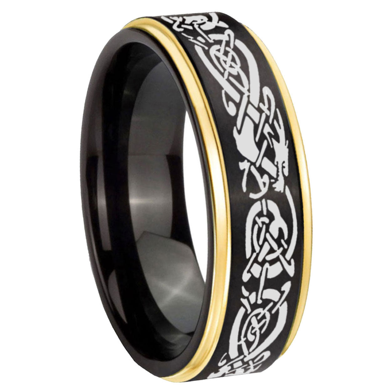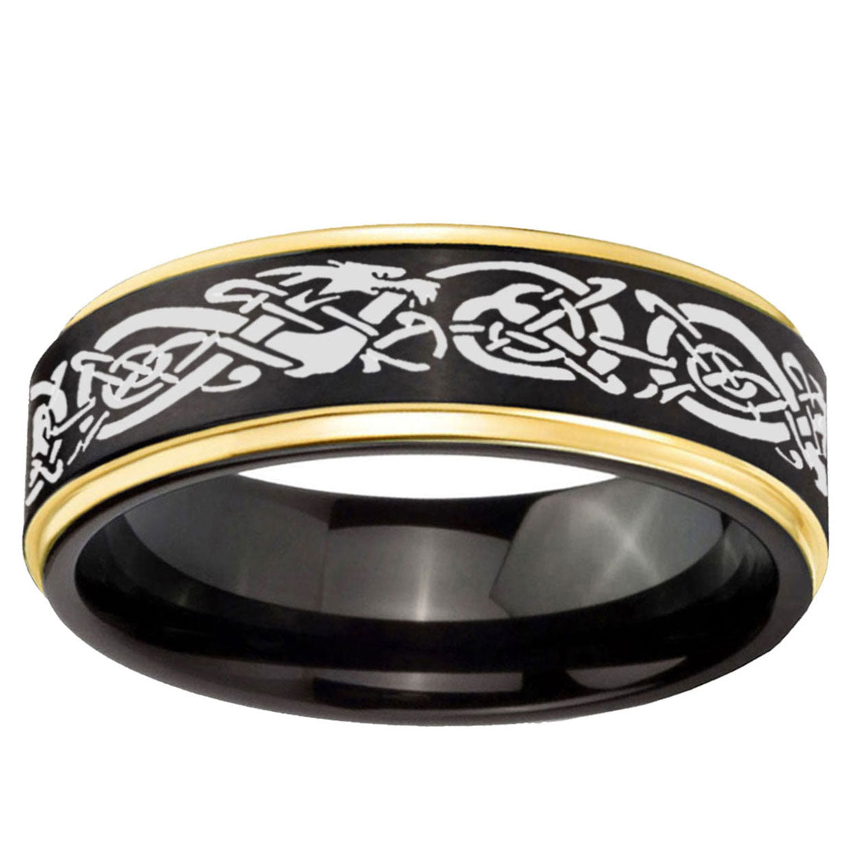 Celebrate with the 10mm Celtic Dragon Gold Step Edges Black Tungsten Carbide Wedding Ring. This gold and black tungsten ring with Celtic dragon design is ideal for weddings.