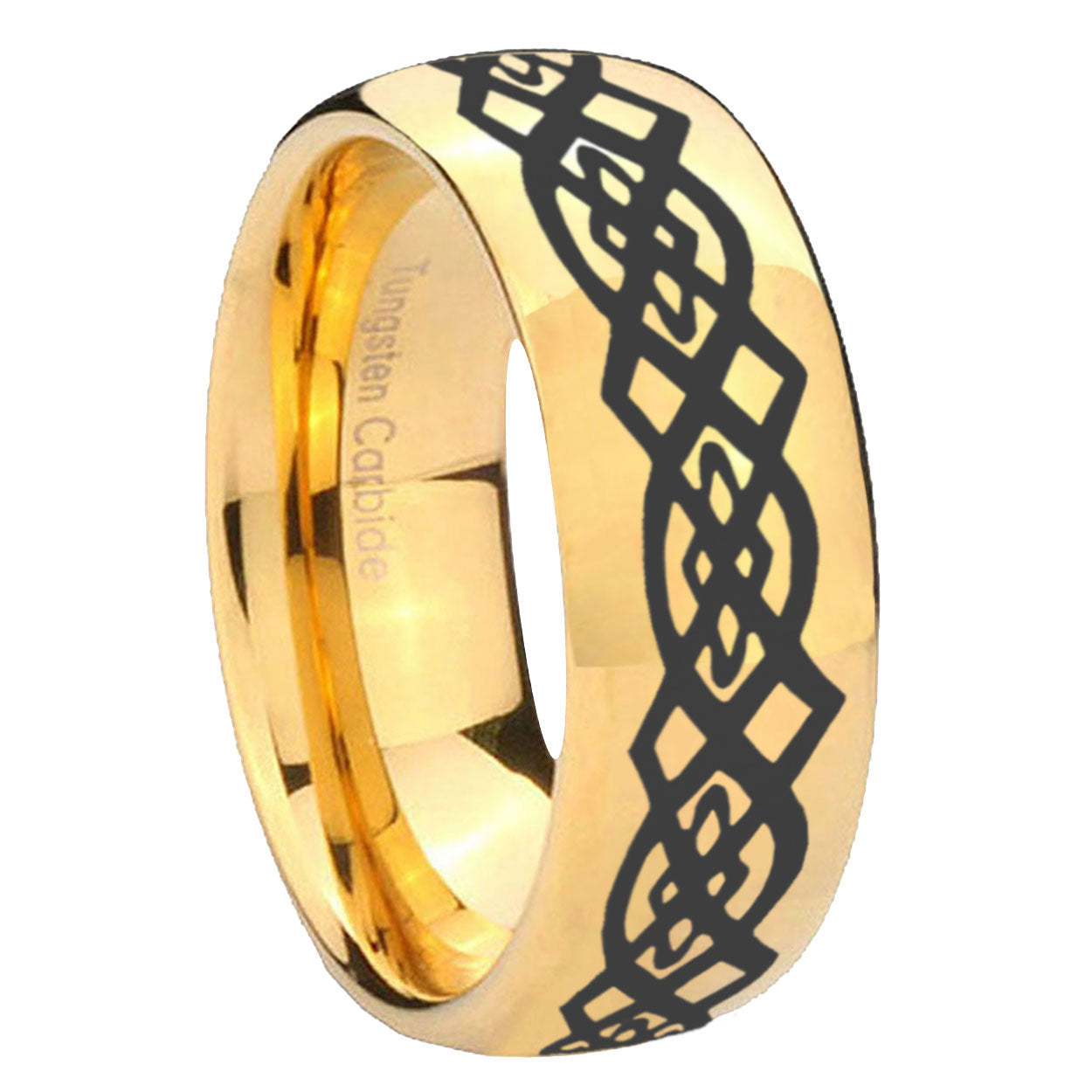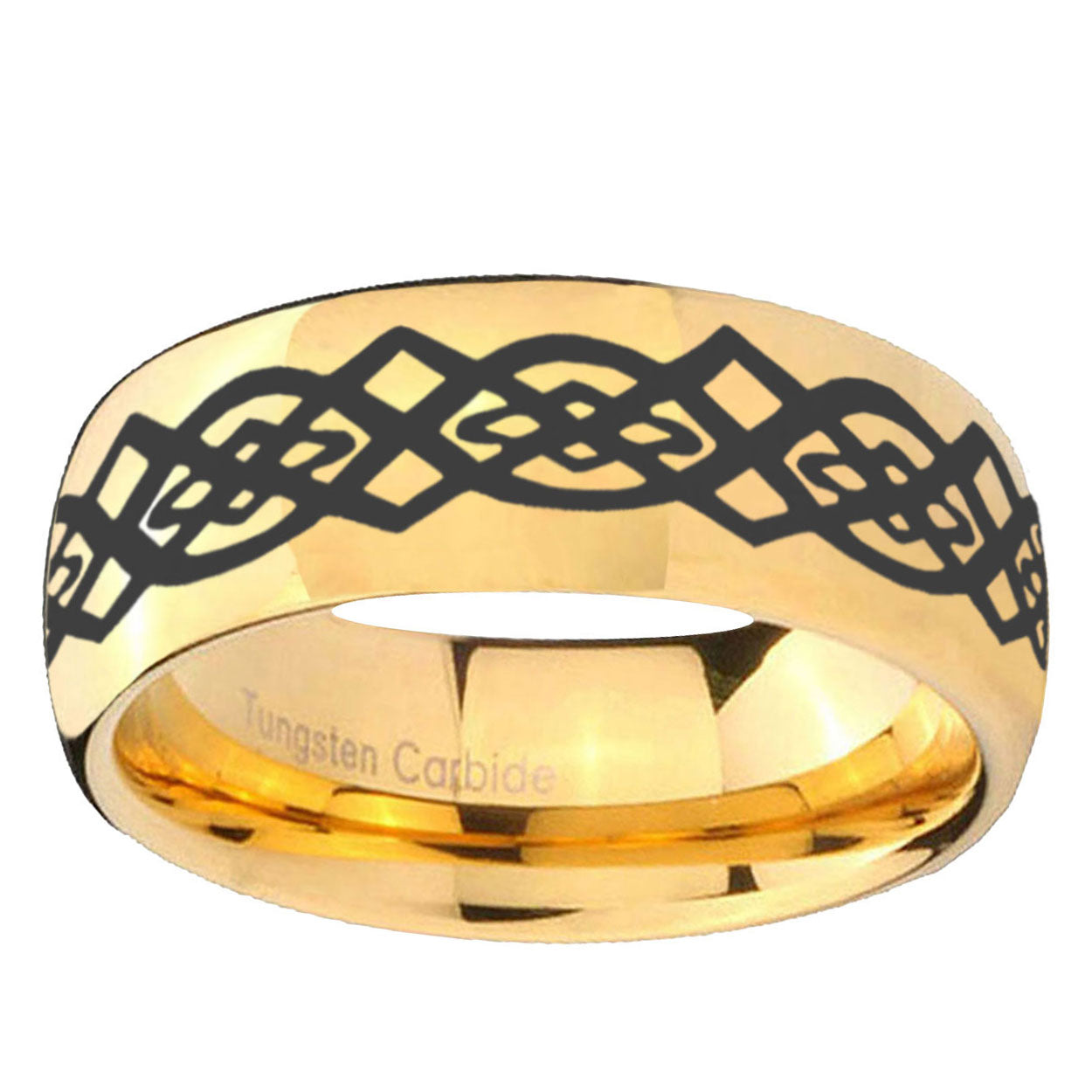 Intruding 5, 8mm Celtic Knot Dome Gold Tungsten Carbide Men's Wedding Ring . Offer in both 5mm and 8mm band width polished 18k gold plated finished from size 4 to 14