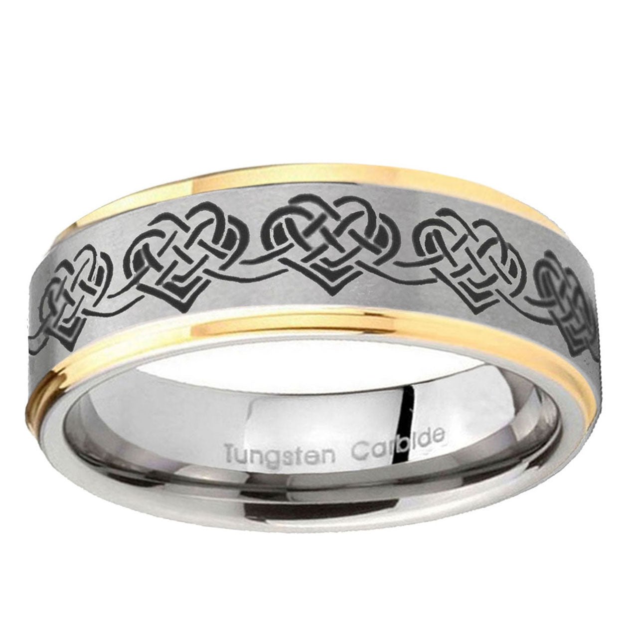 5, 8mm Celtic Knot Heart Step Edges Gold 2 Tone Tungsten Carbide Custom Mens Ring