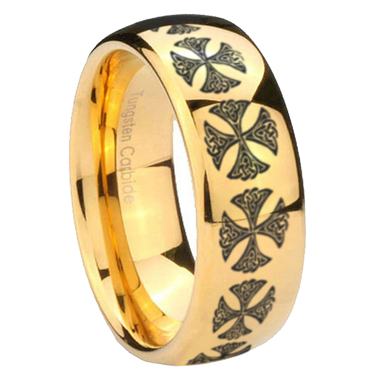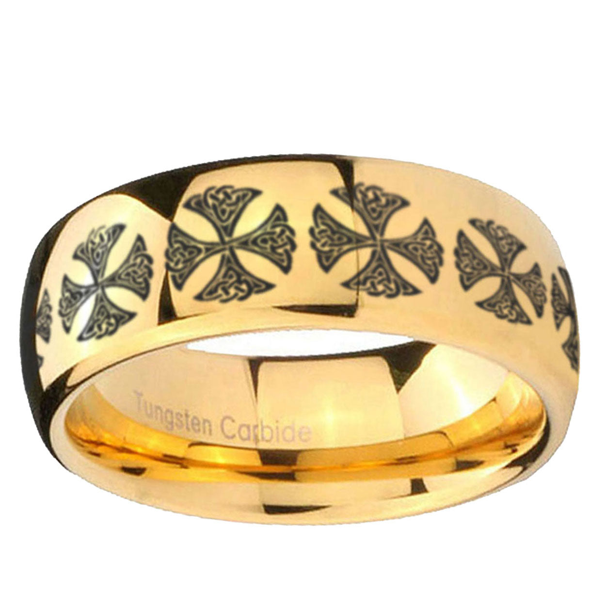 Celebrate with the 10mm Medieval Cross Dome Gold Tungsten Carbide Wedding Band Mens. This gold-finished tungsten ring with Medieval Cross design is perfect for weddings.