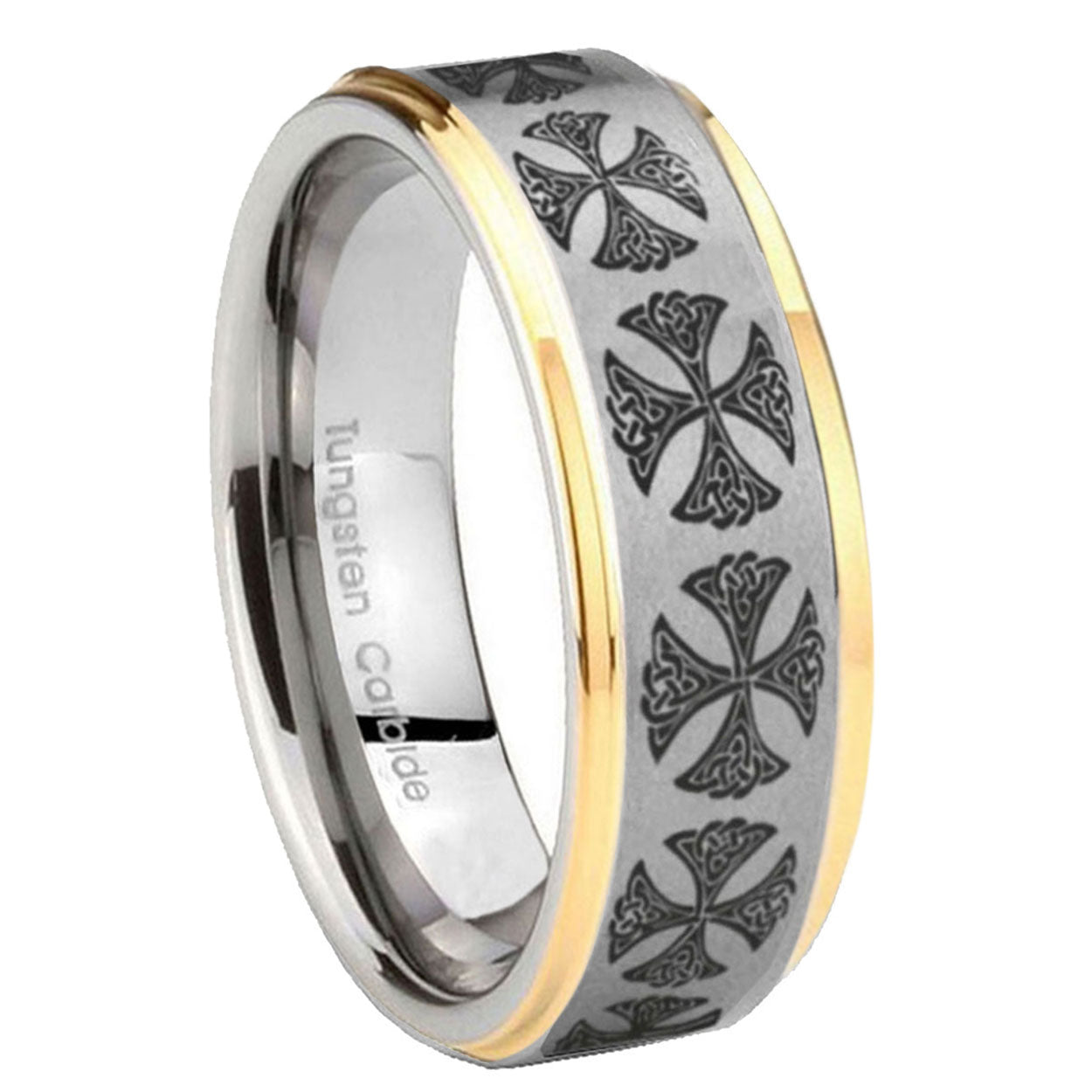 5, 8mm Medieval Cross Step Edges Gold 2 Tone Tungsten Carbide Custom Mens Ring