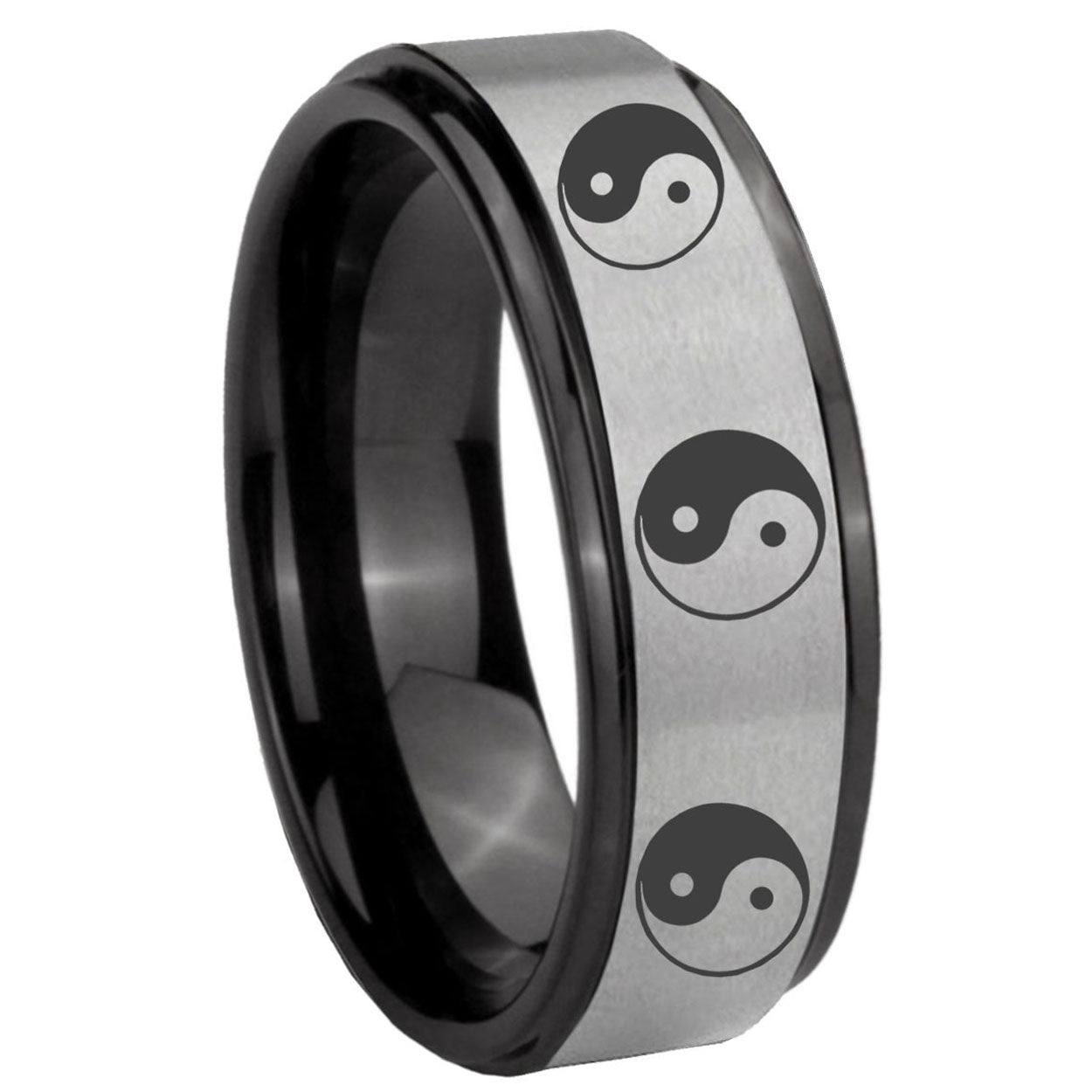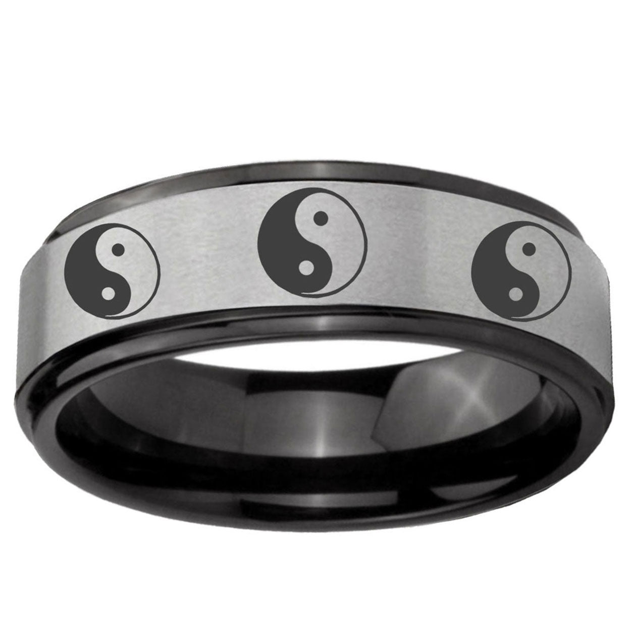 Intruding 6, 8mm Multiple Yin Yang Black Step Edge Gray Tungsten Carbide Promise Ring . Offer in both 6mm and 8mm band width black plated finished from size 7 to 14