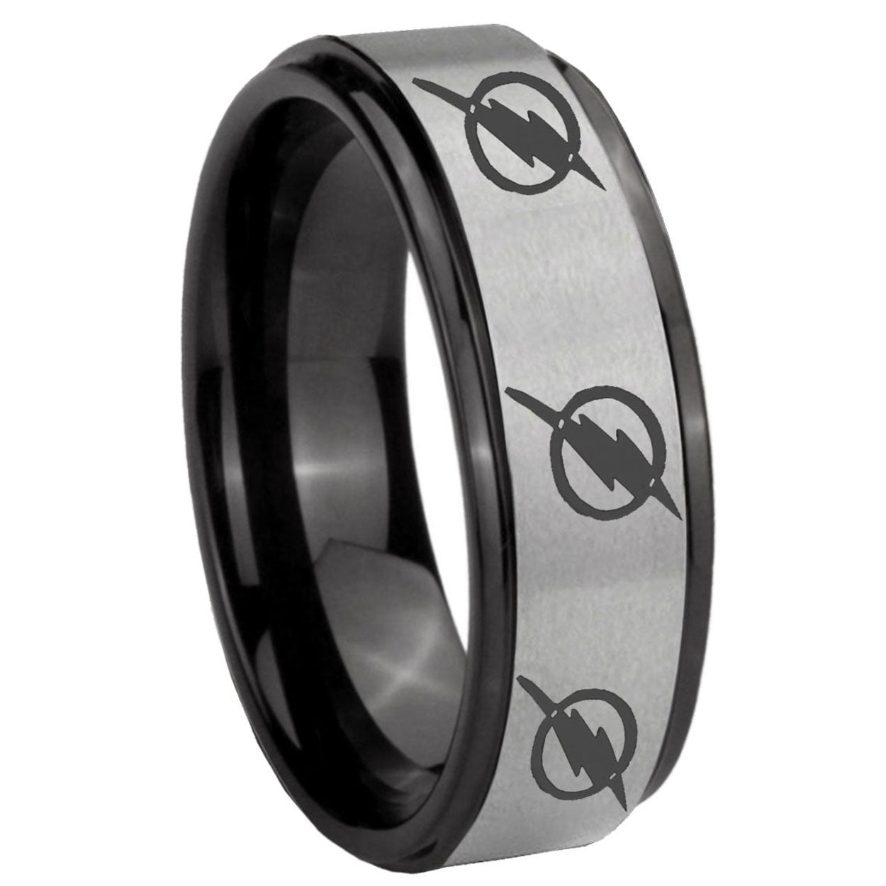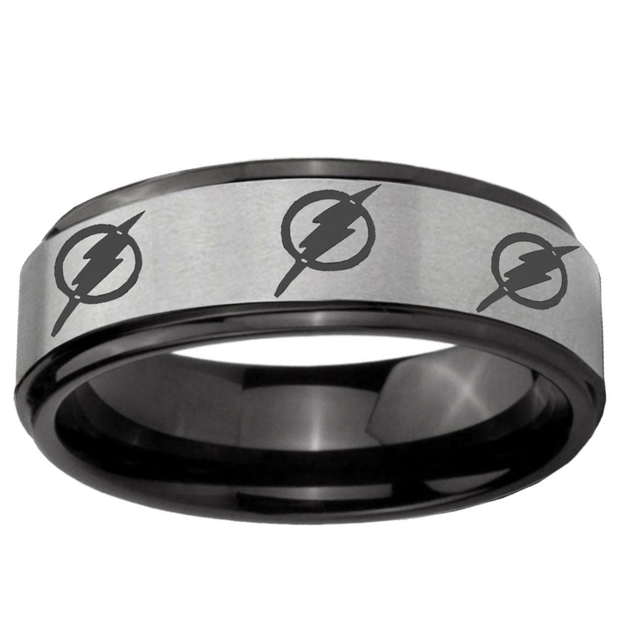Intruding 6, 8mm Multiple Flash Black Step Edge Gray Mens Wide Wedding Bands . Offer in both 6mm and 8mm band width brushed black plated finished from size 7 to 14