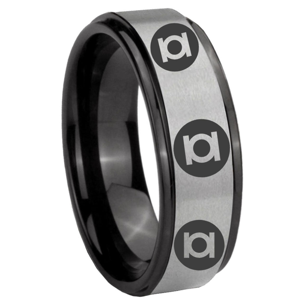 Intruding 6, 8mm Multiple Green Lantern Black Step Edge Gray Unique Men Wedding Ring . Offer in both 6mm and 8mm band width brushed black plated finished from size 7 to 14