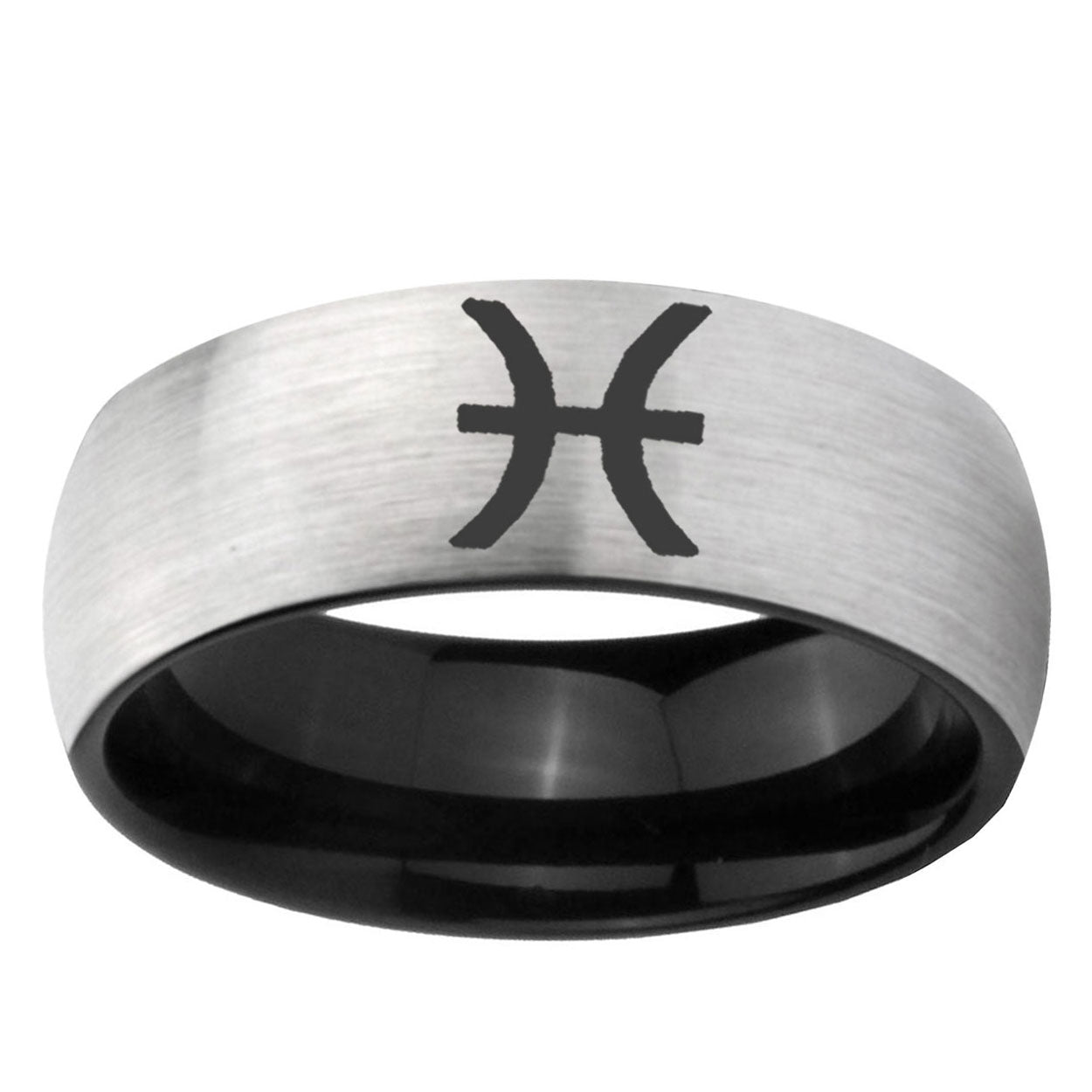 Intruding 6, 8mm Pisces Zodiac Dome Gray And Black Tungsten Carbide Mens Anniversary Ring . Offer in both 6mm and 8mm band width Gray And Black plated finished from size 5 to 14