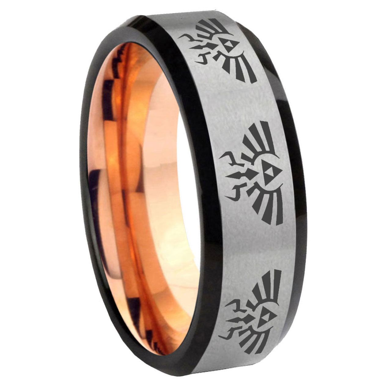 Intruding 6, 8mm Multiple Zelda Skyward Sword Beveled Gray And Rose Gold Tungsten Mens Ring . Offer in both 6mm and 8mm band width gray and rose gold finished from Size 5 to 14