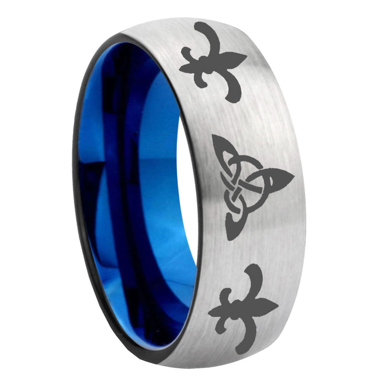 Intruding 6, 8mm Celtic Triangle Fleur-De-Lis Dome Gray And Blue Tungsten Carbide Men's Bands Ring . Offer in both 6mm and 8mm band width gray and blue plated finished from size 5 to 14