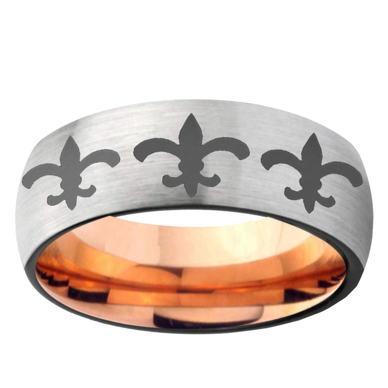 Intruding 6, 8mm Multiple Fleur-De-Lis Dome Gray And Rose Gold Tungsten Carbide Mens Wedding Band . Offer in both 6mm and 8mm band width gray and rose gold plated finished from size 5 to 14