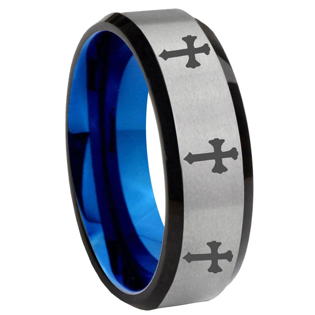 Intruding 6, 8mm Multiple Christian Cross Beveled Blue And Gray Tungsten Rings for Men . Offer in both 6mm and 8mm band width Blue And Gray finished from Size 5 to 14