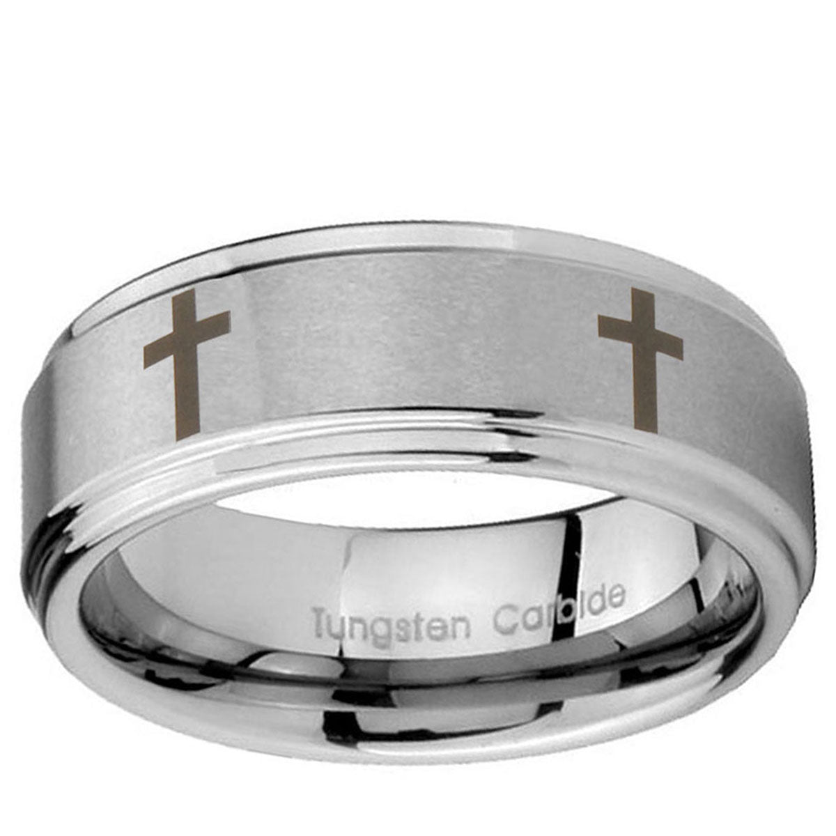 Intruding 5, 8mm Crosses Step Edges Brushed Silver Tungsten Carbide Men's Wedding Band . Offer in both 5mm and 8mm band width brushed grey finished from size 4 to 14
